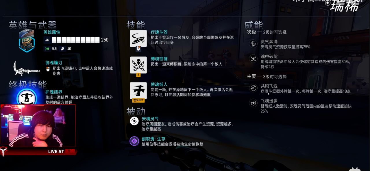 被动技能:安魂灵气——治疗周围盟友。伤害敌人或治疗盟友均可提高灵气的效果。