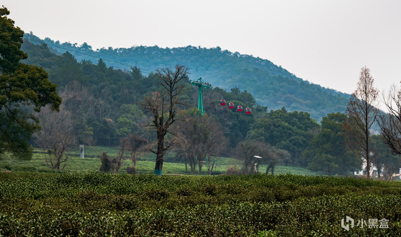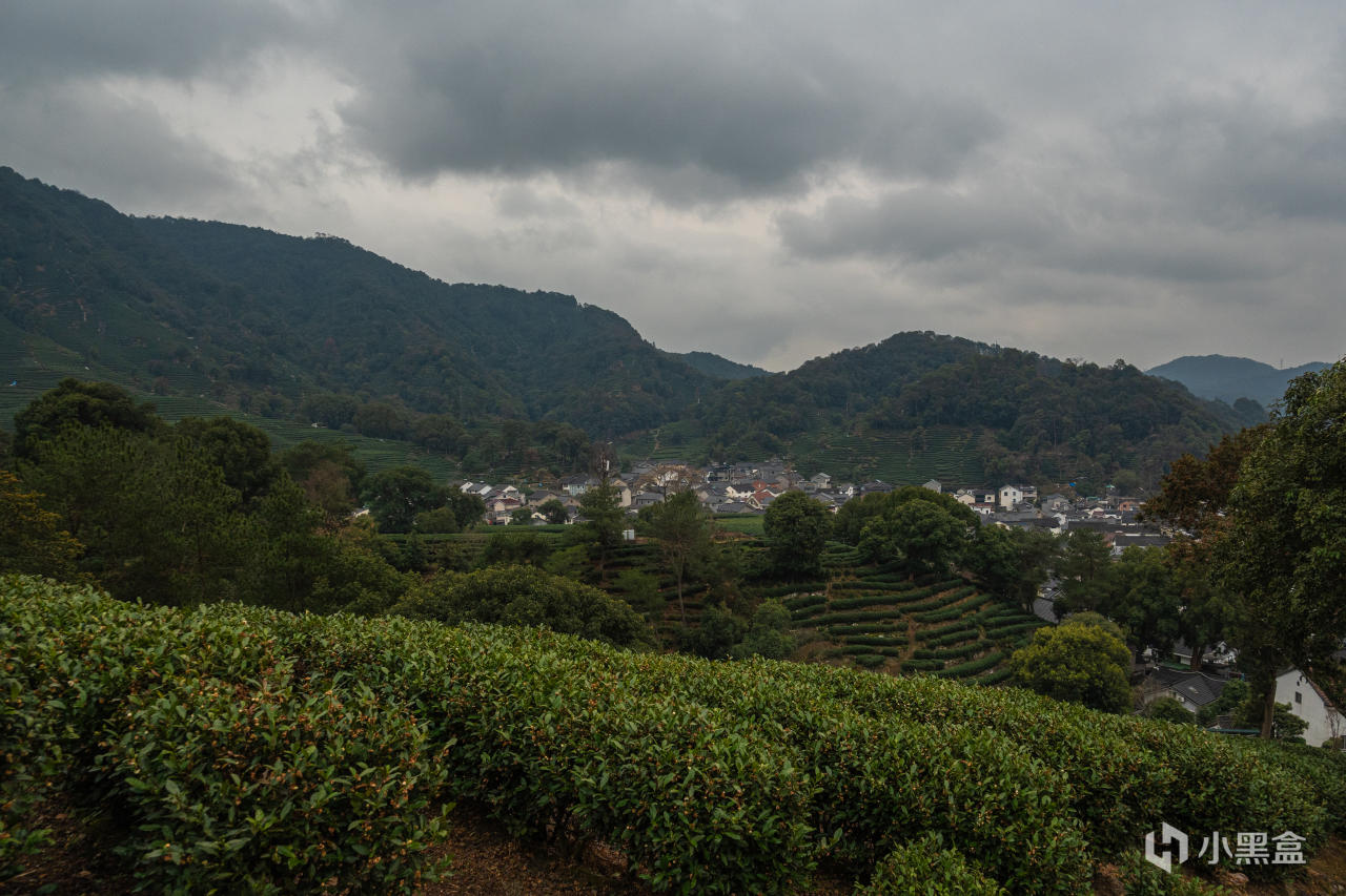 在山上可以看到山下的龙井村及大片的茶树,我爬山的那天是雨天,从山上看大片乌云看上去比较有氛围感。
