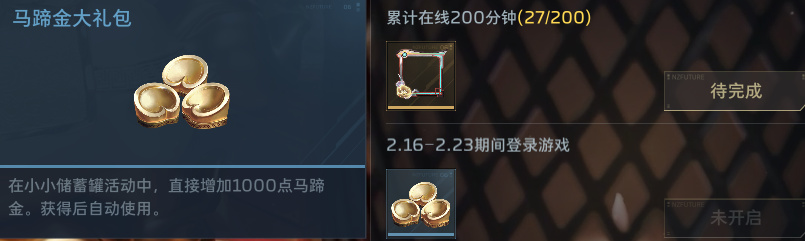 因此理论最大化的行为就是每天把50金子存到储藏罐,最后分8天得到这1650,另外在春节登陆可以获得1000金子(说白了就白送一个黑色贝拉)。