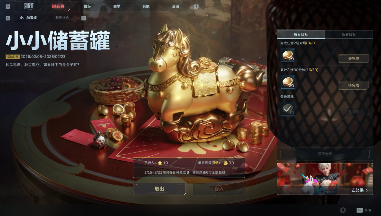 又来一个和开服蓄能一样滑稽的活动,说白了就是每天逼你上线的活动,收益最大化就是屯着。你要是实在搞不懂就每天全部存入,等2月16号后分批领出来。