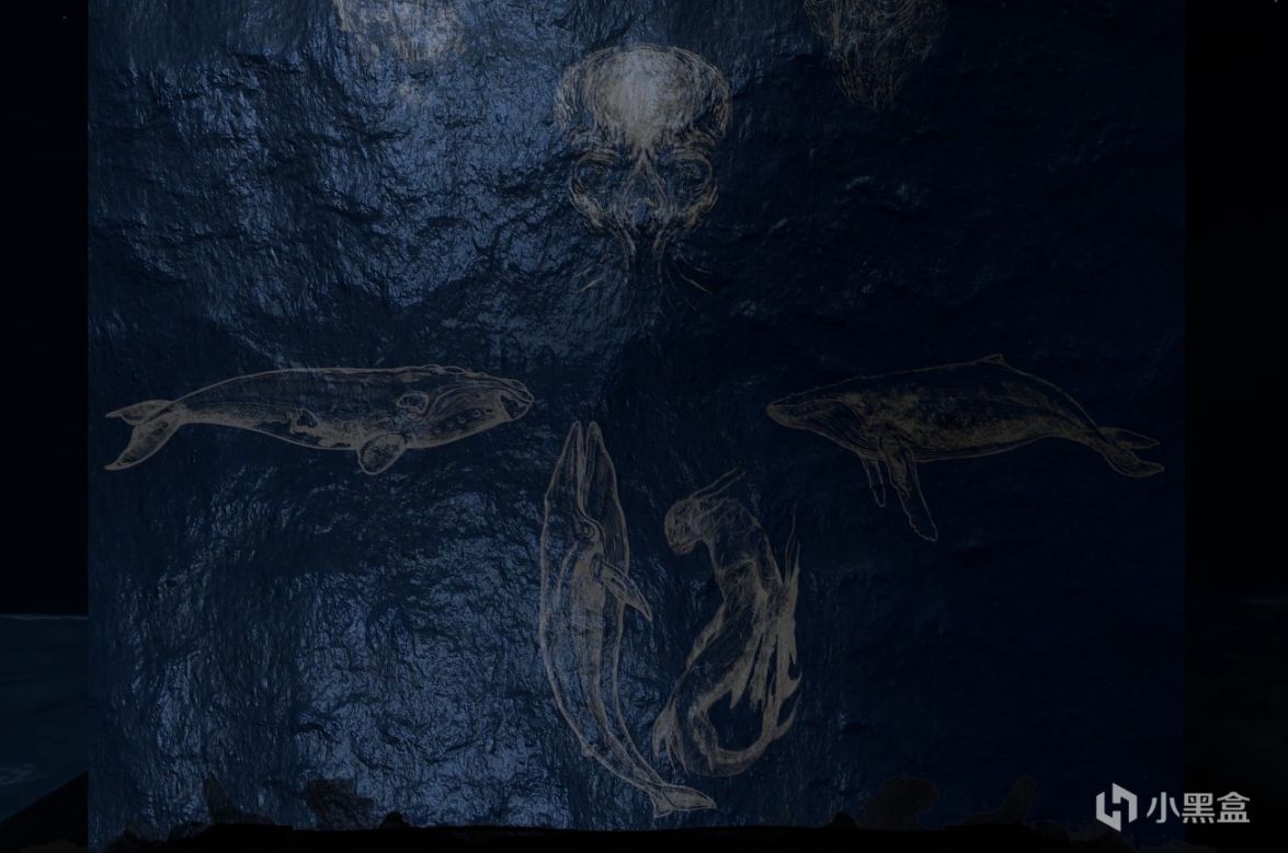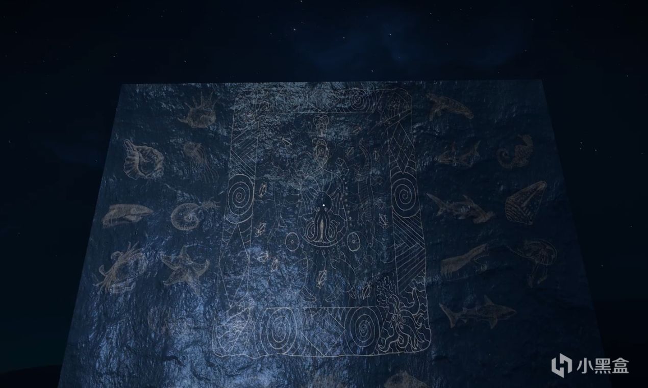 我感到頭暈目眩和恐懼,但也並非沒有科學家或考古學家獨有的那種激動的喜悅,我更加仔細地審視着周遭的環境。現在已然接近穹頂的月亮,怪異又生動地在裂谷峭壁之上閃爍着;它照亮了谷底一條流向遠方的水體,水流朝着兩個方向蜿蜒而出,並且幾乎是在拍打着我站在斜坡上的雙腳。水流穿過裂谷,細小的水波沖刷着巨大石柱的底部;使我現在得以看清石柱表面的銘文和粗糙的雕刻。銘文是由一種我不知道的象形文字體系書寫,和任何我在書中見過的都毫不相似;其內容大部分是由諸如魚類、鰻魚、章魚、貝類、軟體動物、鯨魚等傳統水生符號組成。有一些符號很顯然代表着一些現代世界沒有的海洋生物,不過我倒是已經在那片粘膩平原上見識過它們腐爛分解後的形體了。