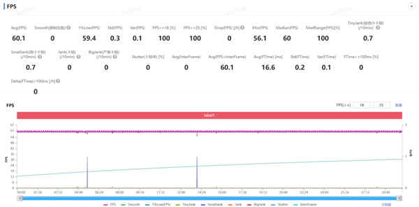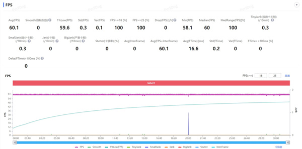 可以看到,iQOO 15 Ultra 跑出来的平均帧依旧有 60.1 帧,依旧是一条水平的直线,1% Low 帧甚至有 59.6 帧。