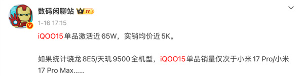 而对于 iQOO 来说,他们的底气来自于 iQOO 15 的卖爆,而且实销均价已经快 5 千。