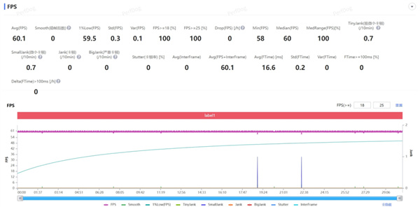 根据 Perfdog 抓取到的数据,在 60 帧 + 画质拉满的条件下,iQOO 15 Ultra 的原神纳塔跑图 30 分钟测试,平均帧为 60.1 帧,几乎就是一条水平的直线, 1% Low 帧只有 59.4 帧,整个跑图过程非常丝滑。