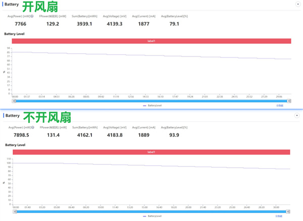 除了这点,我们通过 Perfdog 的数据还发现,开风扇时的整机功耗为 7.8W,对比不开风扇时的 7.9W,其实并没有多大差距。