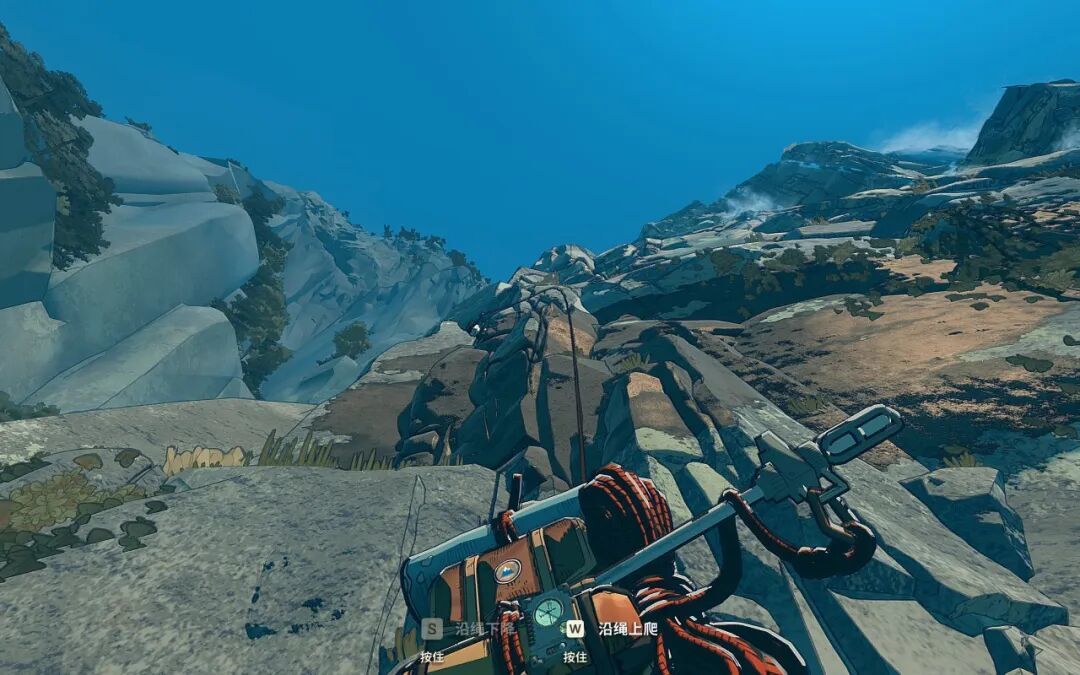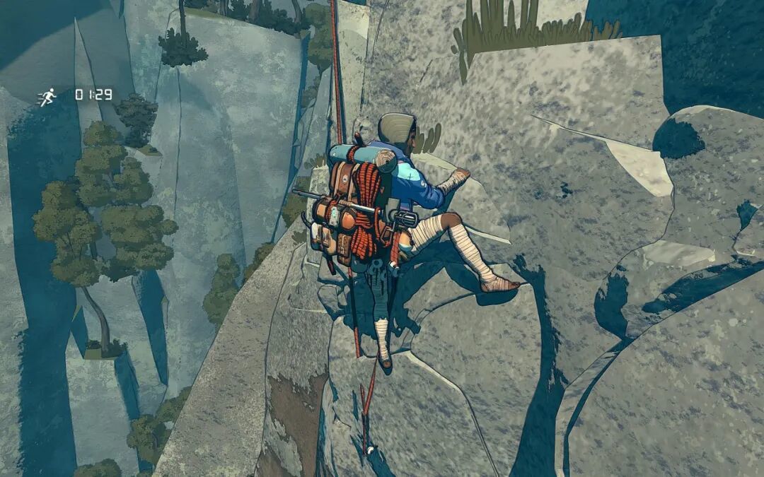 《孤山獨影》便是用這種方式,讓你意識到登山的本質。在不開輔助模式的情況下,遊戲只會在露營地存檔,跌落山崖便意味着從存檔點重新來過。你會反思是不是自己的注意力不夠集中,或者路線選擇有問題。於是你學會了充分利用每一樣道具,滑石粉可以增加手部摩擦力,有限的巖釘是你的臨時存檔點,即使跌落也能救你一命,讓你沿着繩子輕鬆爬回原來的位置。