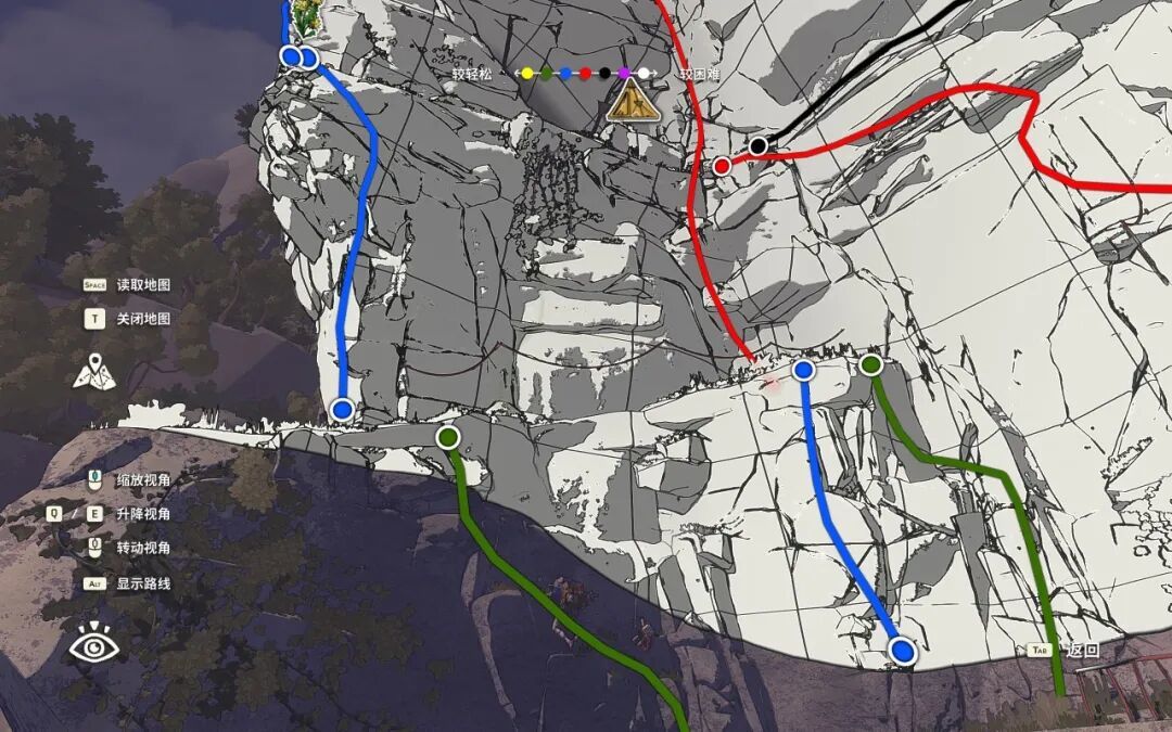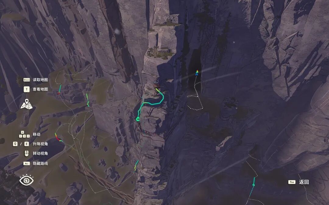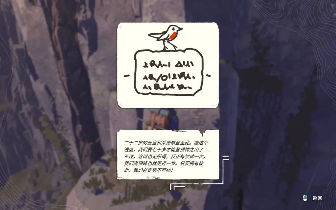 所以,你需要比任何人都清楚,你正在做的是一件什麼樣的事情。除非撿到前人留下的地圖,否則《孤山獨影》都沒有預設的攀爬路線,需要讓你自主觀察山體的情況、牆面的複雜程度、落腳點與着力點的分佈等等要素來勘探路線,選擇適合自己的。這是一件融合了路線規劃、資源管理與風險決策的複合冒險。