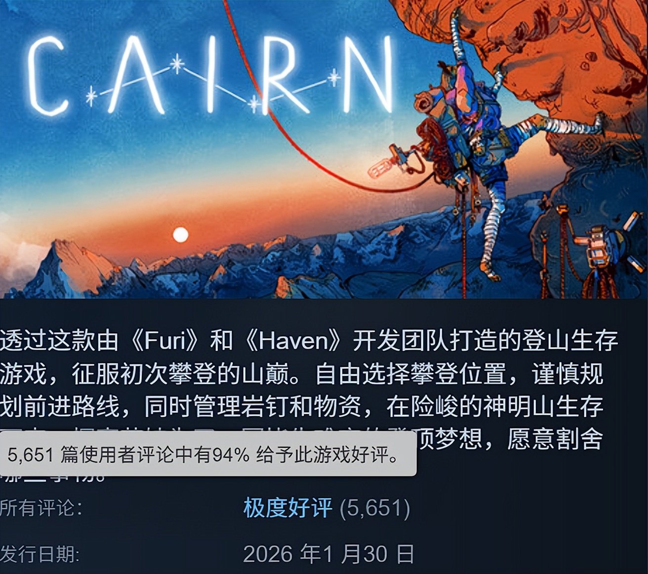 上個月底剛發售的登山生存遊戲《孤山獨影》,就是一款遊戲版本的《孤高之人》。遊戲發售5天時間,已經在Steam上拿到超過5000條評價、94%的好評率。僅限於好評率最爲苛刻的國區,這個數字也有86%。