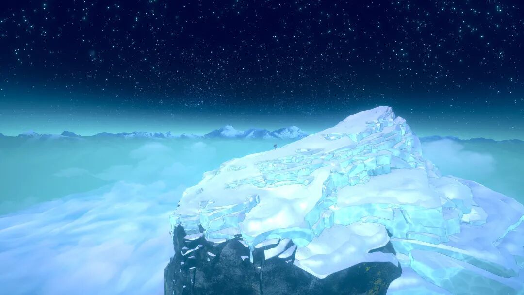 但遊戲不會在這裏結束。帶着體力減半、補給銳減、消耗速度大幅加快的多重Debuff,艾瓦最終成功登頂,她站在山巔發出了勝利的吶喊,然後,開始攀登星辰,彷彿與天空、與神山融爲一體。