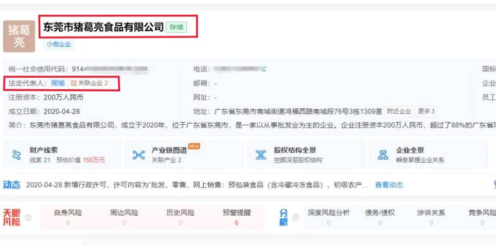 天眼查顯示,東莞市豬葛亮食品有限公司法定代表人爲周瑜,其關聯兩家公司,分別是韶關市豬葛亮食品有限公司和東莞市豬葛亮食品有限公司。