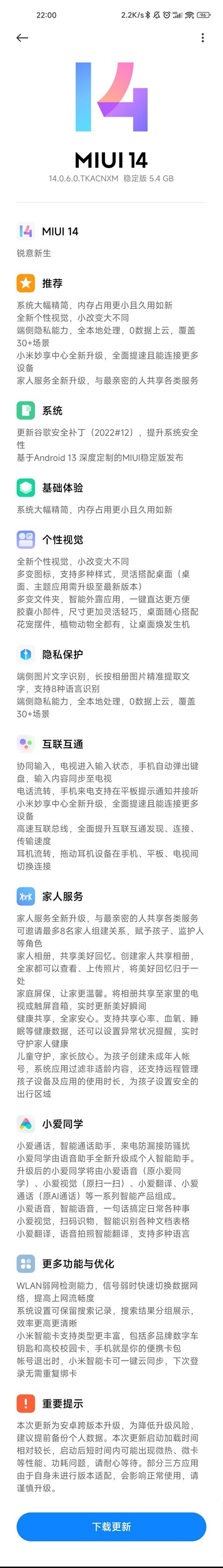 MIUI 14 主打銳意新生,更新亮點包括:系統大幅精簡,內存佔用更小且久用如新;光子引擎架構,系統應用與三方應用全面加速,不僅流暢且更省電;全新個性視覺,小改變大不同;端側隱私能力,全本地處理,0 數據上雲,覆蓋 30 + 場景;小米妙享中心全新升級,全面提速且能連接更多設備;家人服務全新升級,與最親密的人共享各類服務。