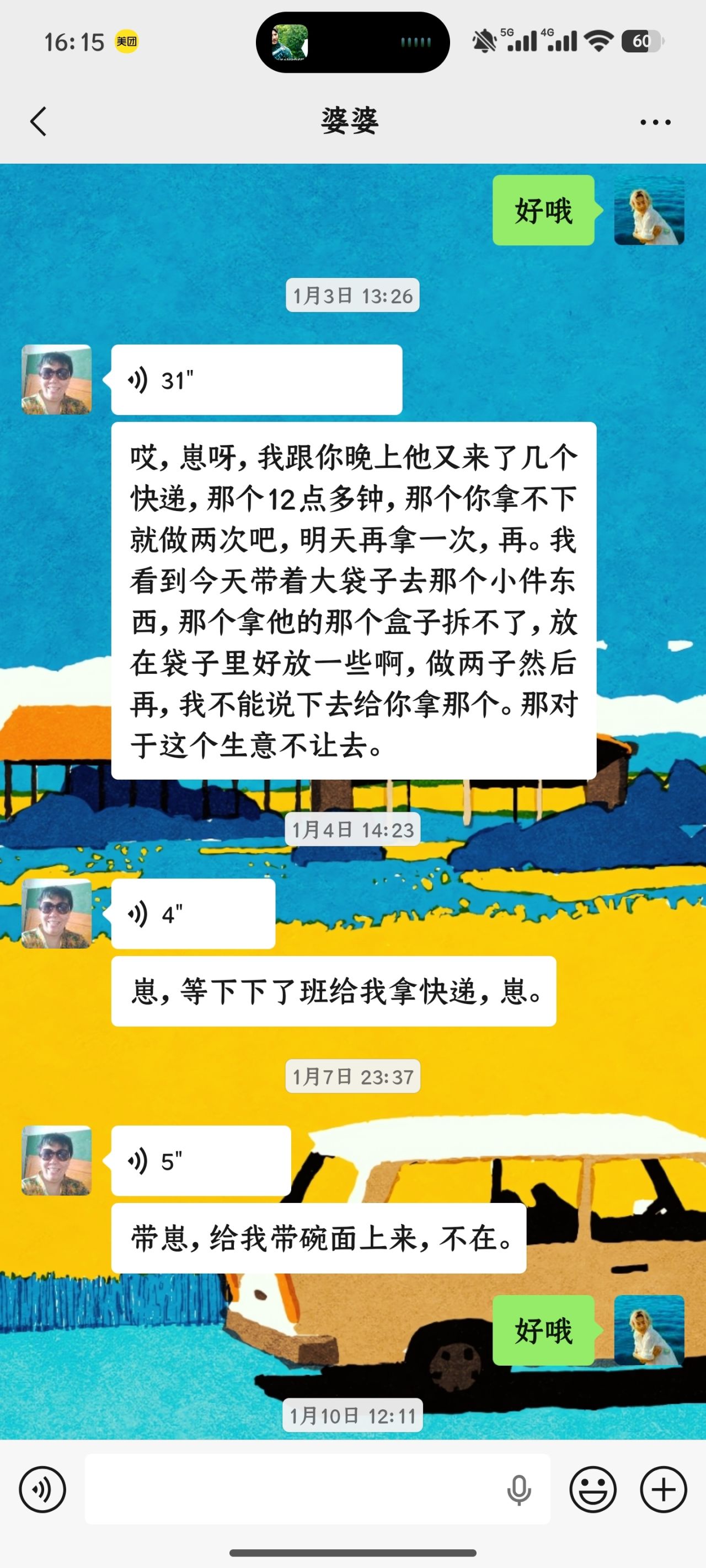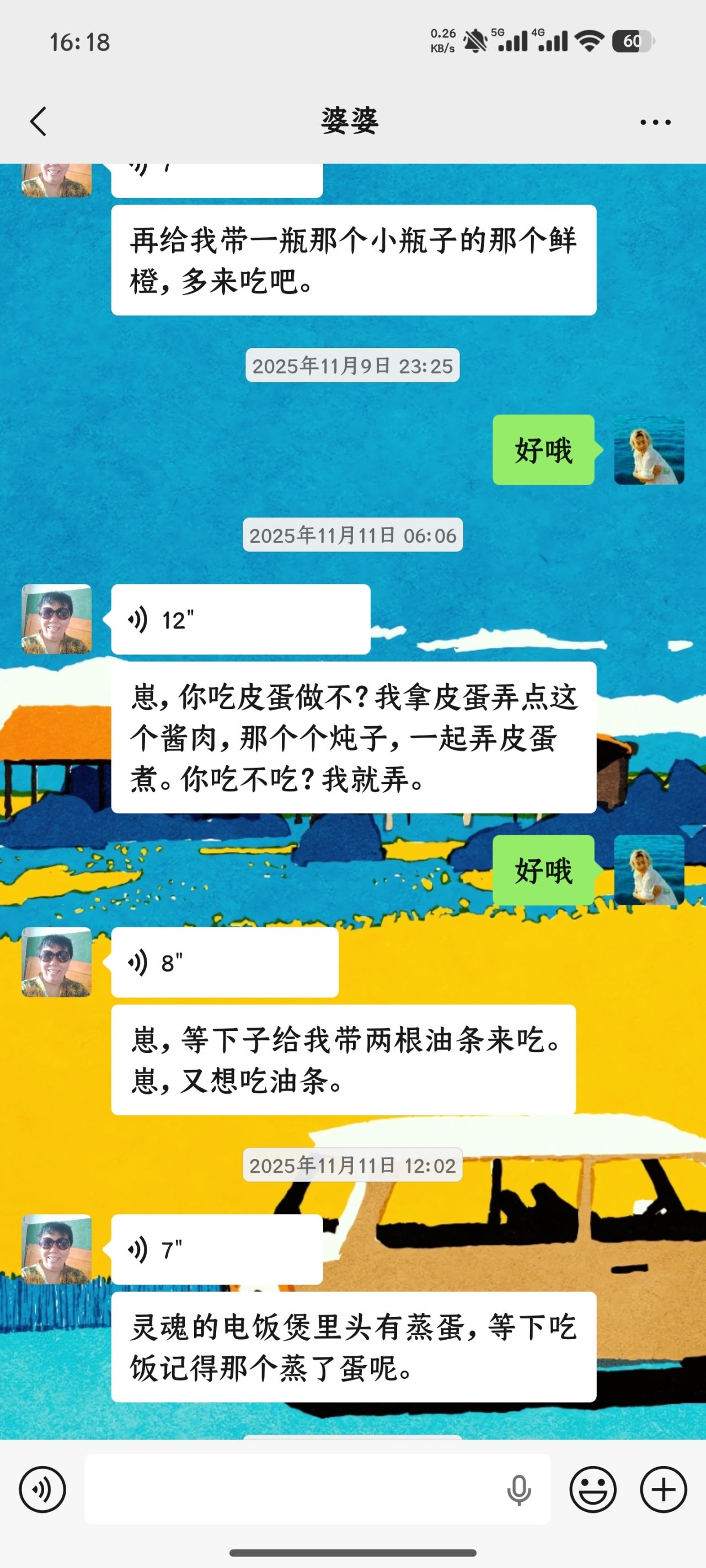 在我淋雨时会让我赶紧洗澡的老人、在我饥饿的时候会为我做饭的老人、在我闲暇时会招呼我做事的老人、在我骑车很冷时会为我买手套的老人、在我离家去别的城市会哭泣的老人、在我于远方时给她打电话会问我饿了没有瘦了没有的老人、在我回家时会崽呀崽呀叫我的老人、经常让我给她带快递的老人。