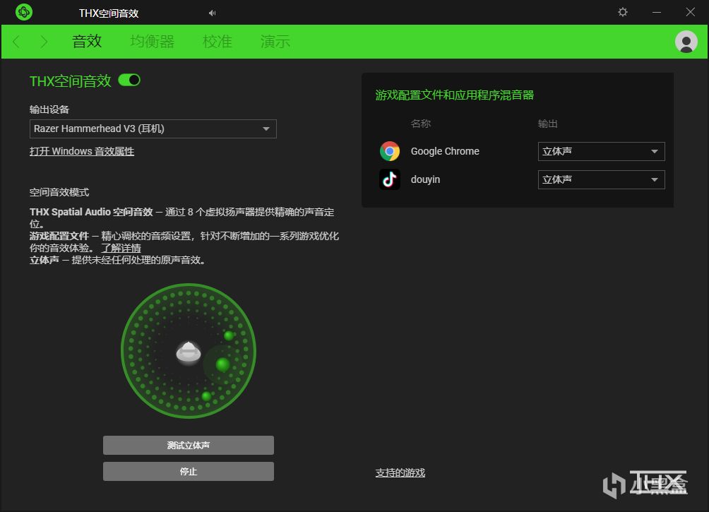 “THX Spatial Audio”這個驅動主要是用來打開THX空間音效功能,而這個功能的作用是通過8個虛擬揚聲器提供更好的聽身辨位效果。驅動中可以測試開啓後的效果怎麼樣,可以明顯感受到聲音細節更加豐富,可以讓自己的判斷更加準確。