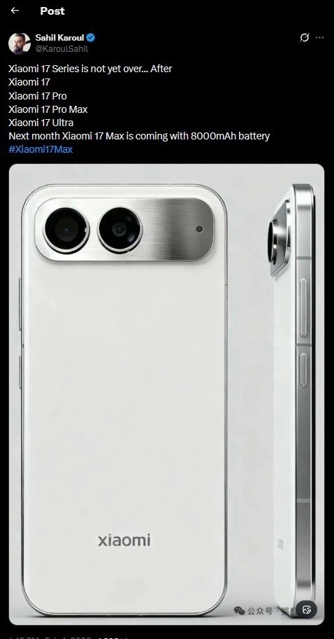 據報道,小米將於下月(3月)發佈一款重磅新機——小米17 Max。