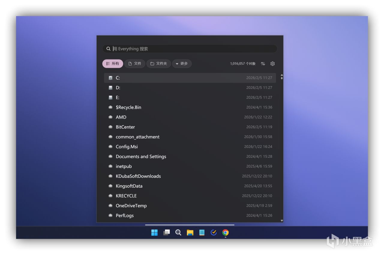 開始使用:安裝完成後,任務欄會出現Everything圖標,點擊即可開始搜索,支持快捷鍵Win+Space呼出搜索框