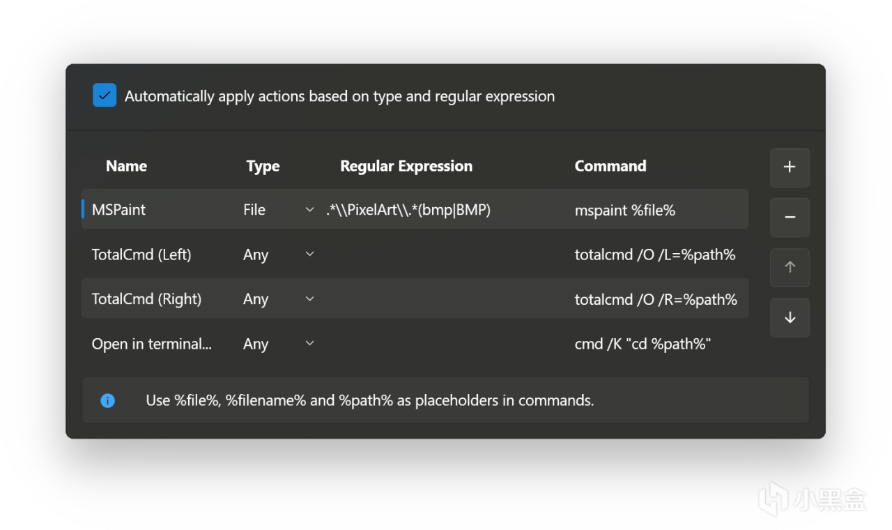 通過導航到設置 → 自定義操作創建自定義的打開方式操作。啓用根據條件自動應用規則可以基於文件類型和正則表達式自動執行命令。將正則表達式字段留空,則該操作僅在上下文菜單中顯示。