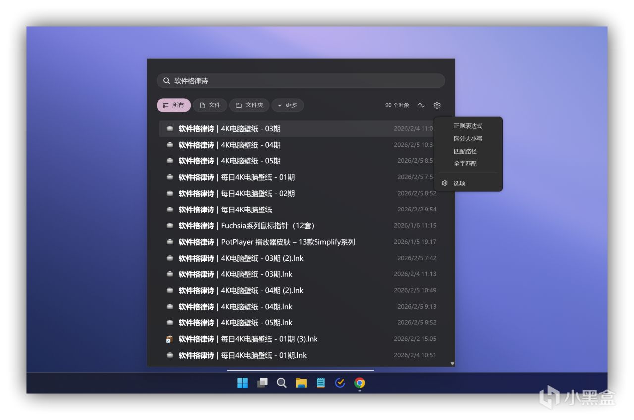 EverythingToolbar最大的特點就是將Everything的超強搜索能力直接嵌入Windows任務欄。點擊任務欄上的圖標,搜索框立即彈出,輸入幾個字母,結果即刻呈現。不需要切換窗口、不需要記憶快捷鍵,就像任務欄原生功能一樣自然流暢。