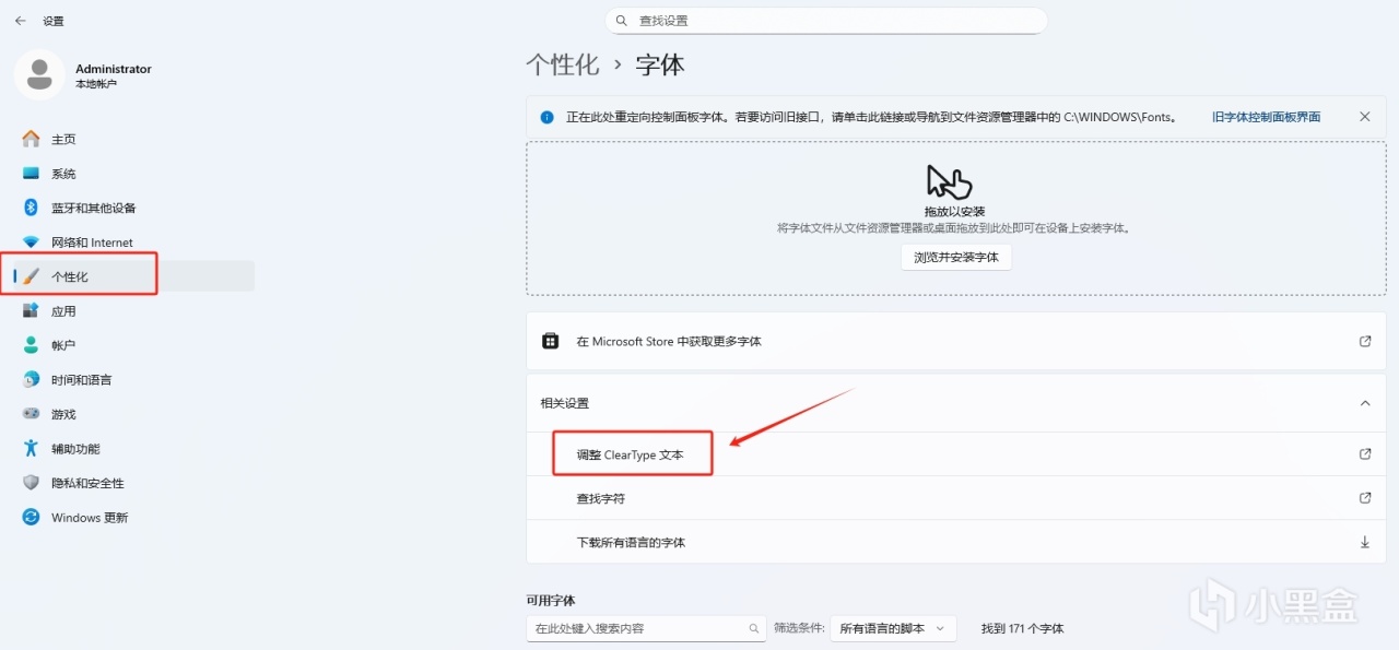 【設置】→【個性化】→【字體】→【相關設置】→【調整ClearType 文本】→【按照文字提示進行調節】