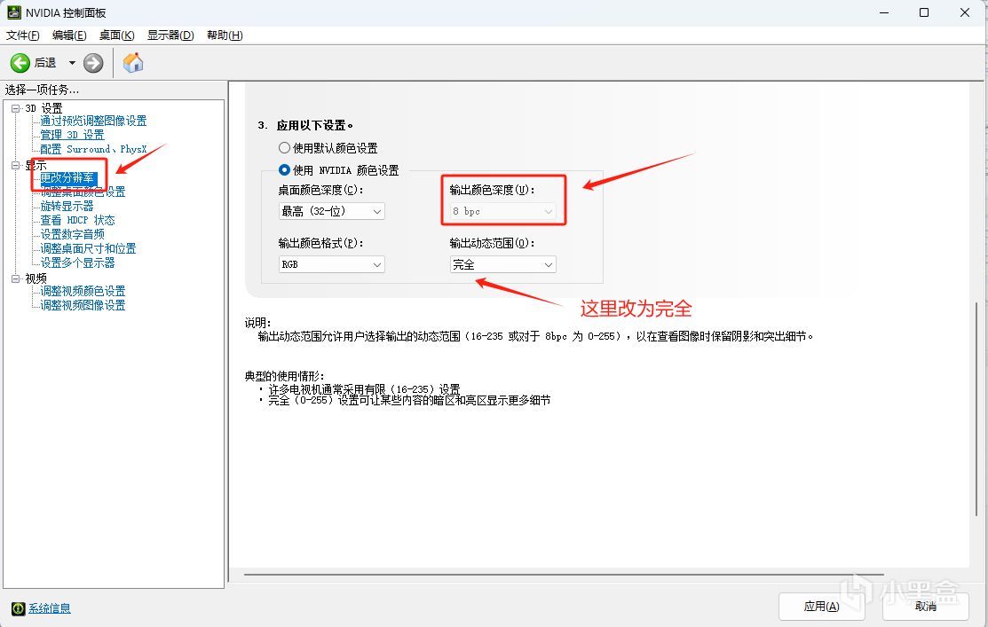 桌面鼠標右鍵選擇【NVIDIA控制面板】,進入後選擇【分辨率】,在【輸出顏色深度】中,選擇10bit後應用,調到10bit後,色彩會更加飽滿,下面這個輸出動態範圍改爲完全。
