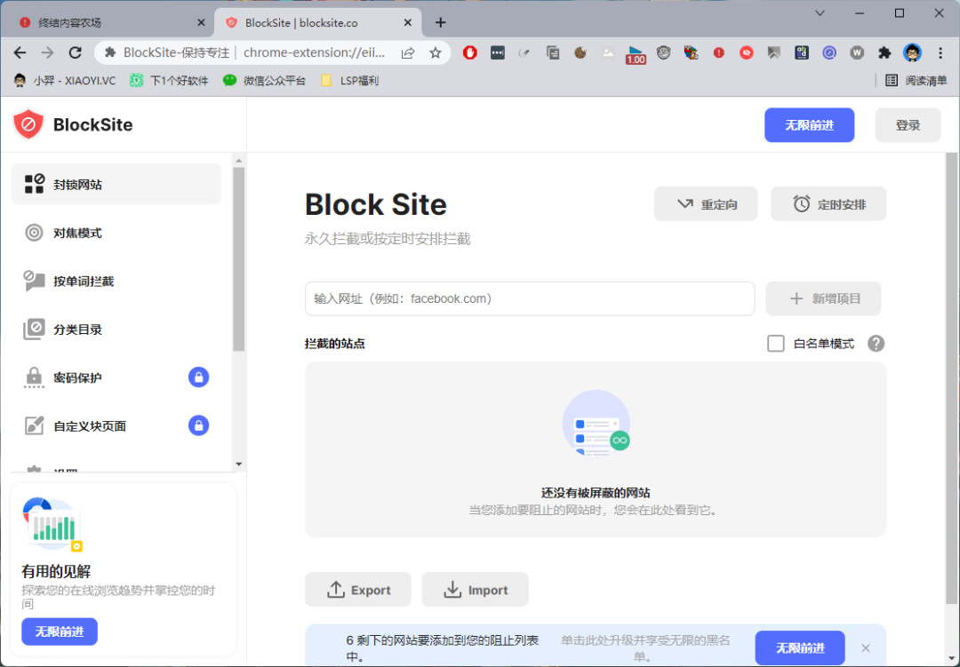这个「BlockSite」功能相对来说更人性化些,支持对网址进行归类目录、密码保护功能、自定义页面样式、支持时间定时、根据单词拦截,规则同步等功能。还有提供手机客户端下载。不过这个扩展插件是需要付费的,免费版只能用基础功能。