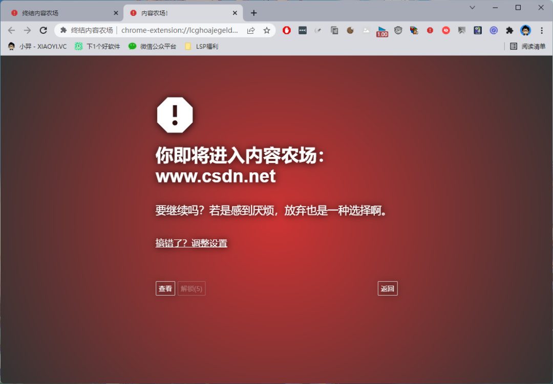 当你打开黑名单里面的网址时就会自动重定向到一个警告页面,如果你觉得这个页面没问题,想要看的话,可以点击下面的解锁按钮。