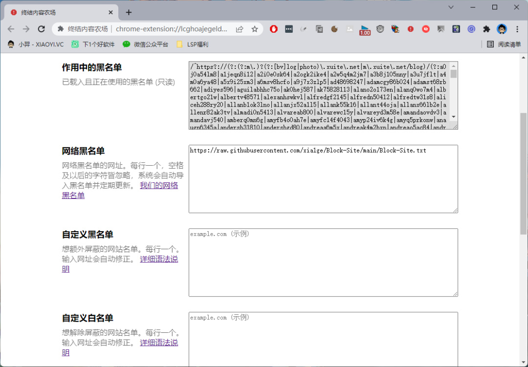 网址规则方面,这款「终结内容农场」已经自带了不少垃圾网址,使用方法,进入「终结内容农场」的设置,网络黑名单里面,添加上,然后保存,刷新下页面就生效了。你也可以手动自定义黑名单、白名单。
