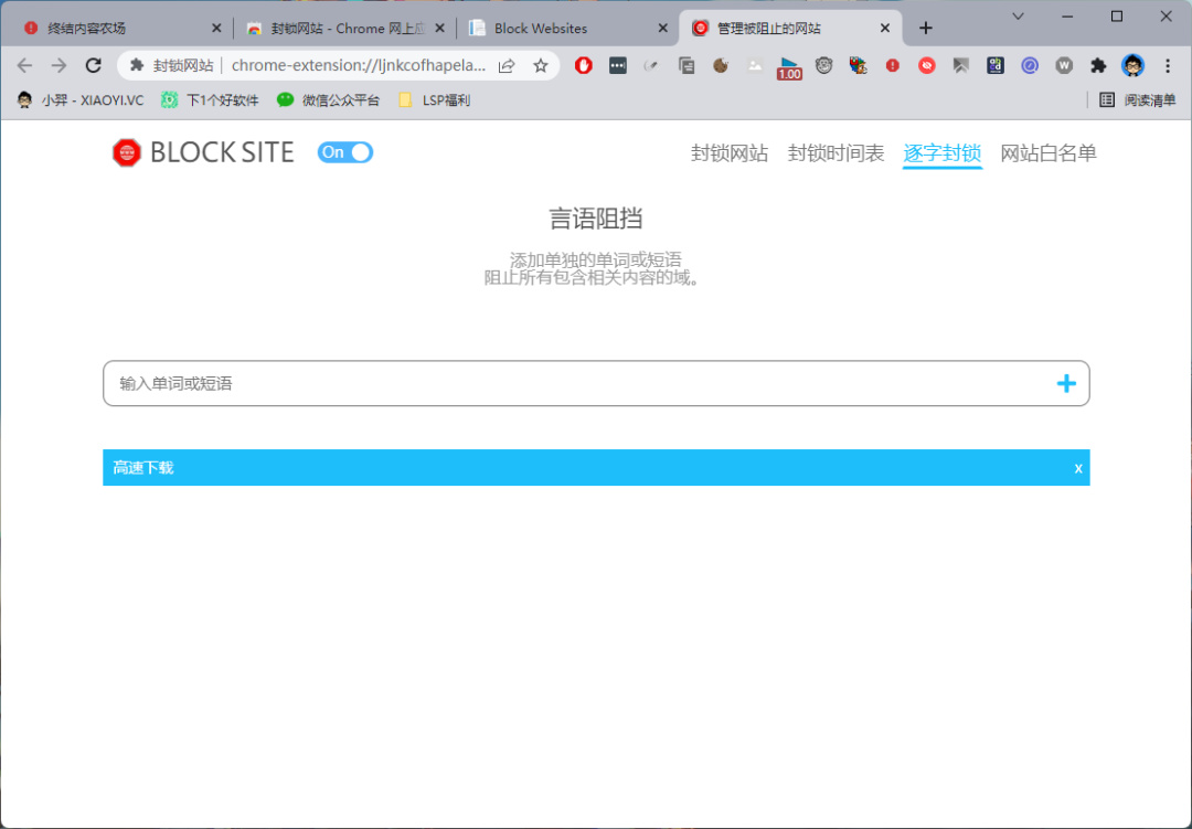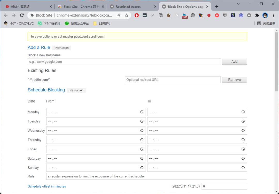 这个「封锁网站」扩展使用起来比较简单,支持时间规则限制、黑名单、白名单,值得一提的是,可以添加词语关键词来阻止一些内容。总的功能性不如上面提到的两款,也不能订阅规则,作为辅助用还行。