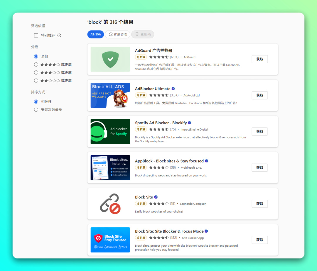 ✅ 1.浏览器安装「广告过滤」插件,屏蔽竞价排名虚假官方,目前主流的插件有 AdGuard、Adblock、uBlock Origin 等。安装好后,通常勾选 EasyList 的规则就能屏蔽大部分推广,如果你需要更严格的屏蔽,自己勾选规则即可。