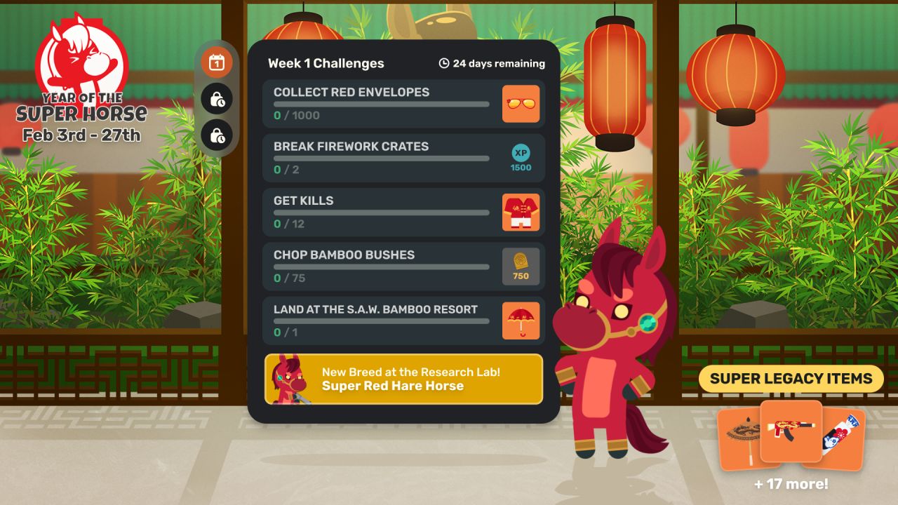 早在2018年底便在Steam上开启了抢先体验的免费联机游戏《超级动物大逃杀(Super Animal Royale)》近日宣布:“超级马年”活动现已上线。本次活动将持续至2月27日,陪玩家一起热闹过年!
