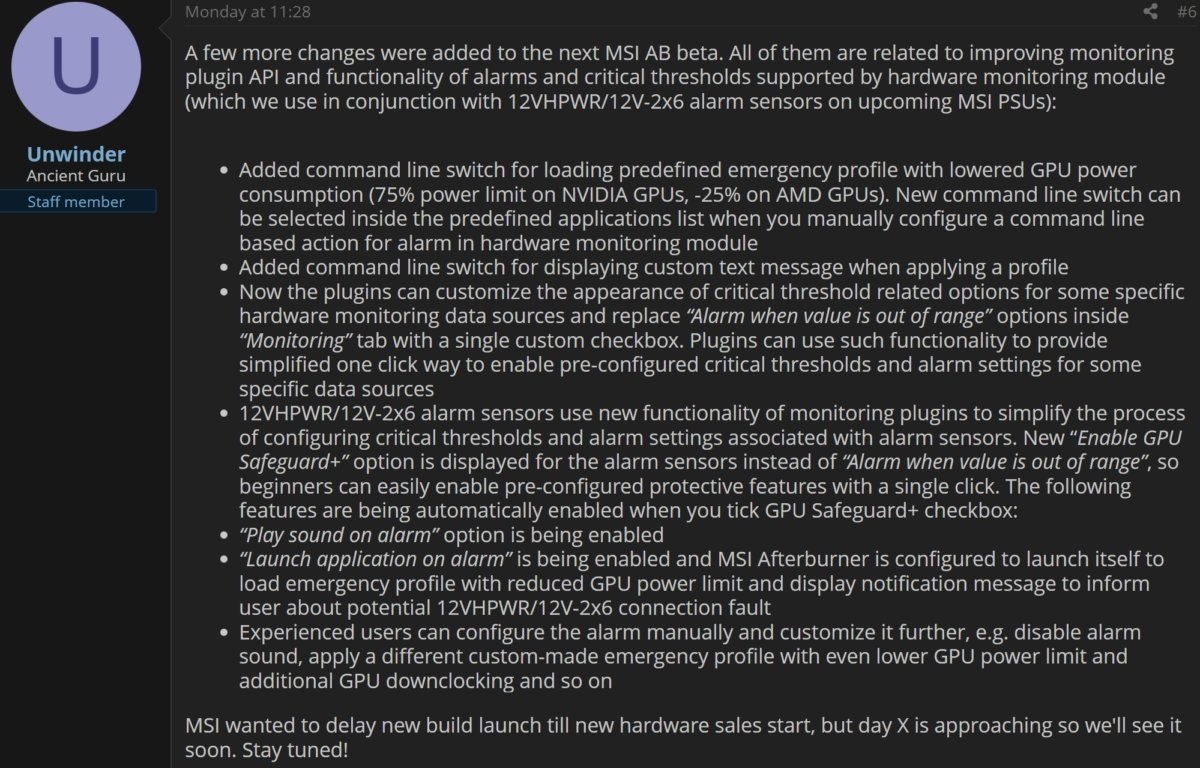 下一个微星Afterburner(MSI AB)测试版中又新增了几项更新,全部围绕监控插件API的优化,以及硬件监控模块所支持的警报与临界阈值功能展开(该模块将与微星下一代电源上的12VHPWR/12V-2x6警报传感器配合使用):