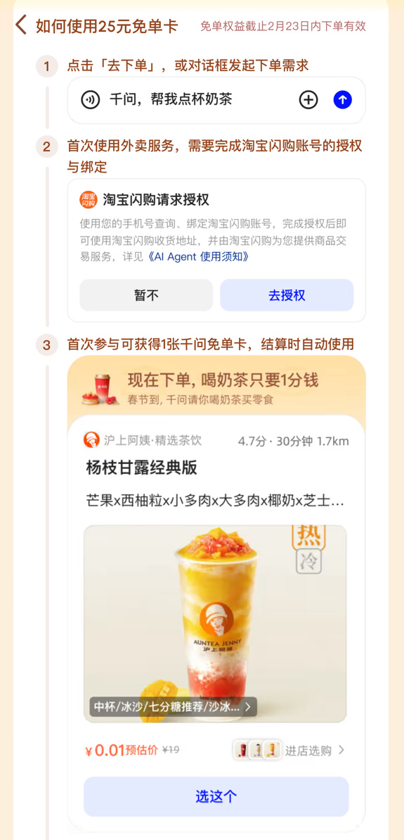 用户跟千问对话“千问,帮我点杯奶茶”即可获得 25 元无门槛免单卡(免单权益 2 月 23 日内下单有效)。平台同时设置了邀请奖励,邀请新用户可额外获得免单卡,邀请 3 位新用户更有机会参与抽取价值万元的“千问AI生活卡”。