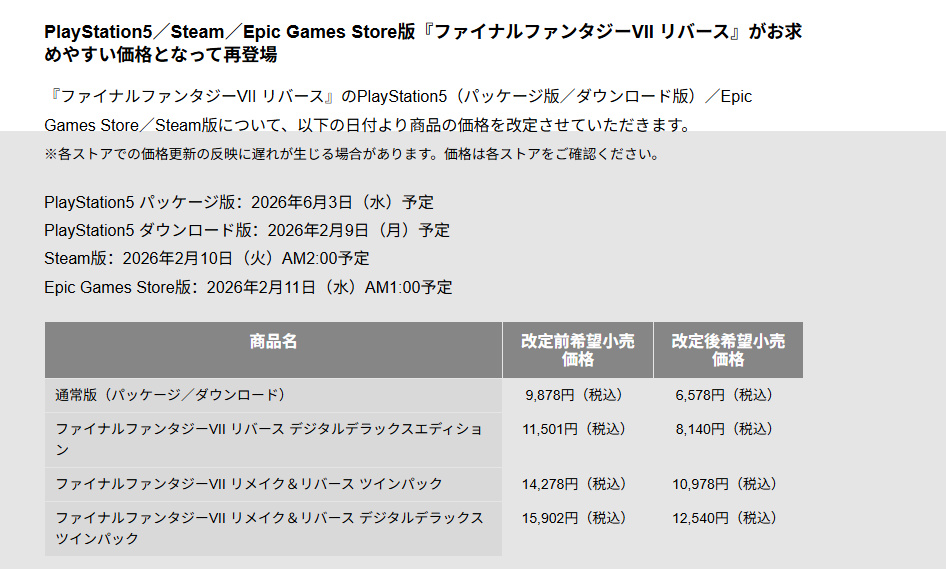 今日,根据SE官方发布的公告,《最终幻想7:重生》各平台将于 2 月陆续调价,其中 PS5 数字版自 2026 年 2 月 9 日起,Steam版自 2026 年 2 月 10 日凌晨 1 点起,Epic版自 2026 年 2 月 11 日凌晨 0 点。PS5实体版则计划于 2026 年 6 月 3 日调整。