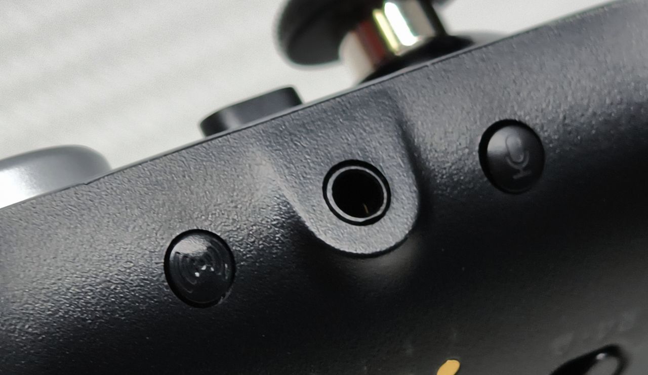 后面目光移到手柄的底部你可以看到3.5mm的耳机孔闭麦键和配对键。这类设计蛮适合主机用户使用的,非常方便。