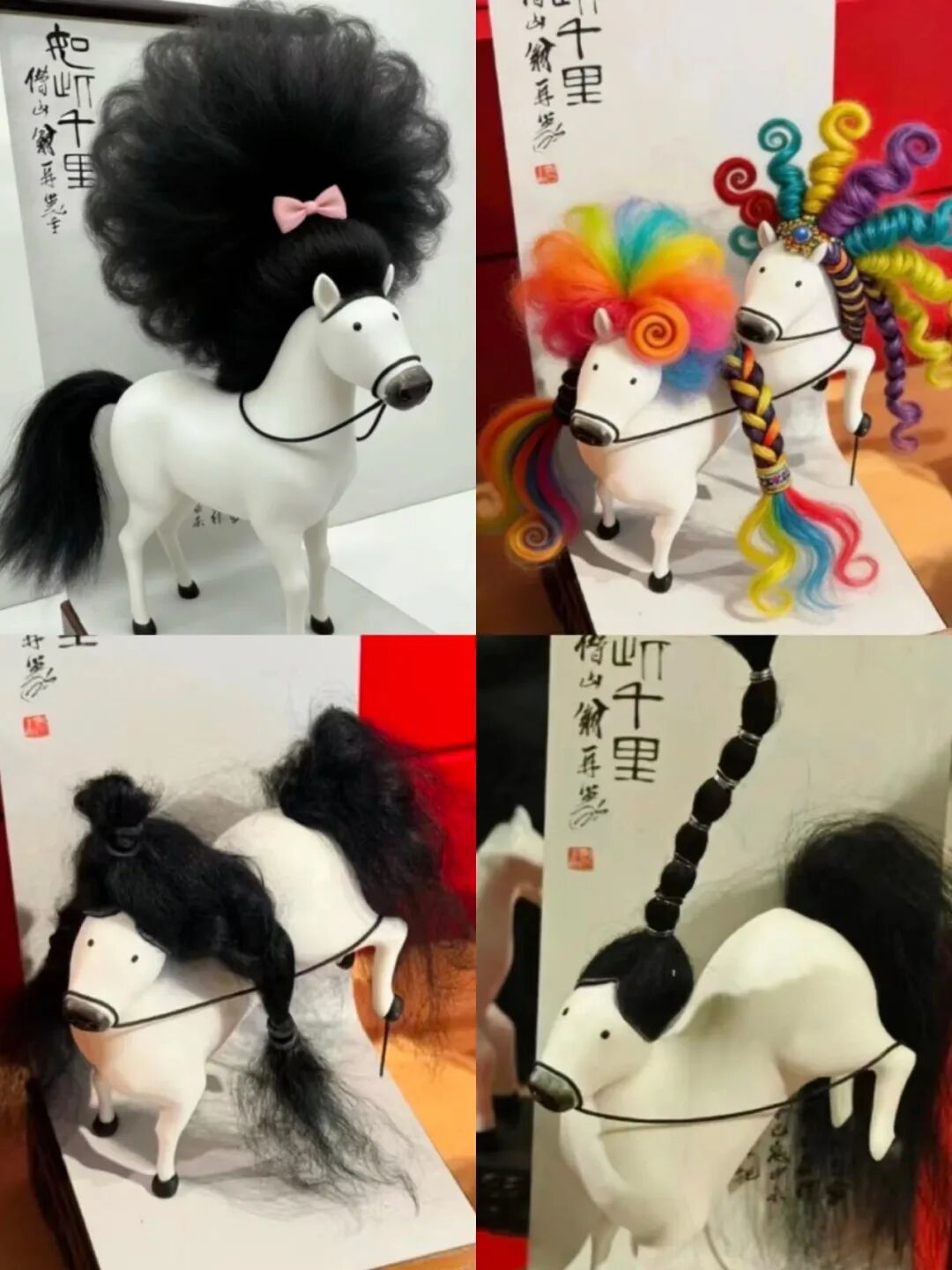 同样走红的还有“潦草小马”。这款玩偶拥有与齐白石晚年奔马图《如此千里》相似的不羁线条,加上一头用仿真毛发制成的蓬乱“秀发”,迅速俘获了年轻消费者的心。