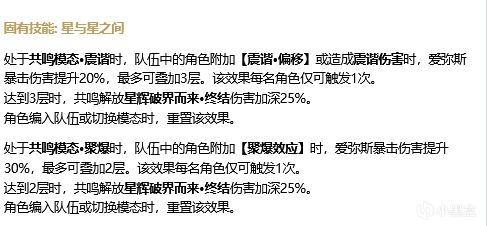 固有技能方面,优先点亮第二个,队友造成震谐相关伤害时提升爱弥斯爆伤20%,最高叠三层60%,聚爆相关伤害提升30%爆伤,最高两层60%,白嫖的爽爽吃!