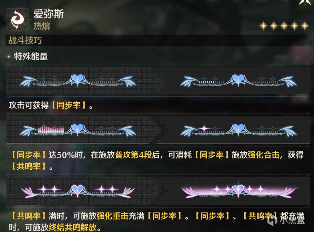 看人先看回路条,爱弥斯的回路条由下方的同步率和上方的星星形态的共鸣率构成,爱弥斯的玩法简单来说就是攒星星(共鸣率),星星满了释放强化重击充满双条开二段大招。所以如何获得星星就是弄清爱弥斯玩法的基础。