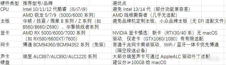 硬件兼容是黑苹果的基础,选对硬件 = 成功 80%,笔记本适配难度远高于台式机,优先选台式机搭建,以下是「高兼容硬件清单」(避坑版)