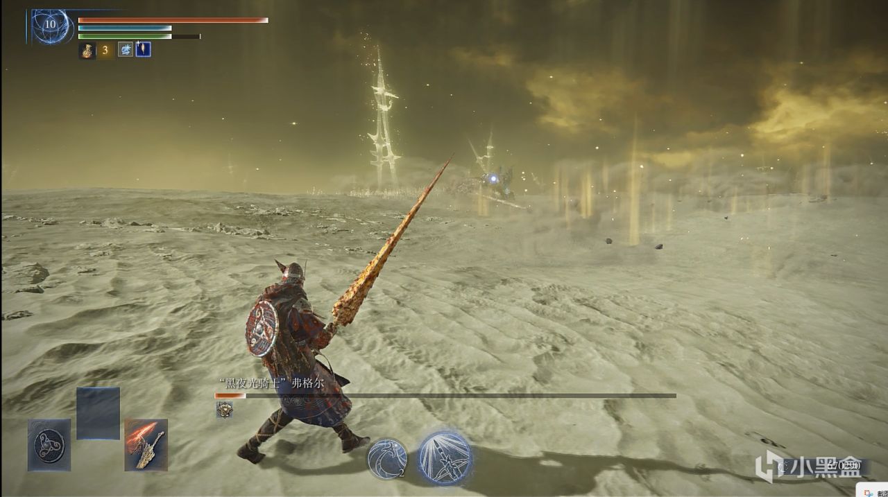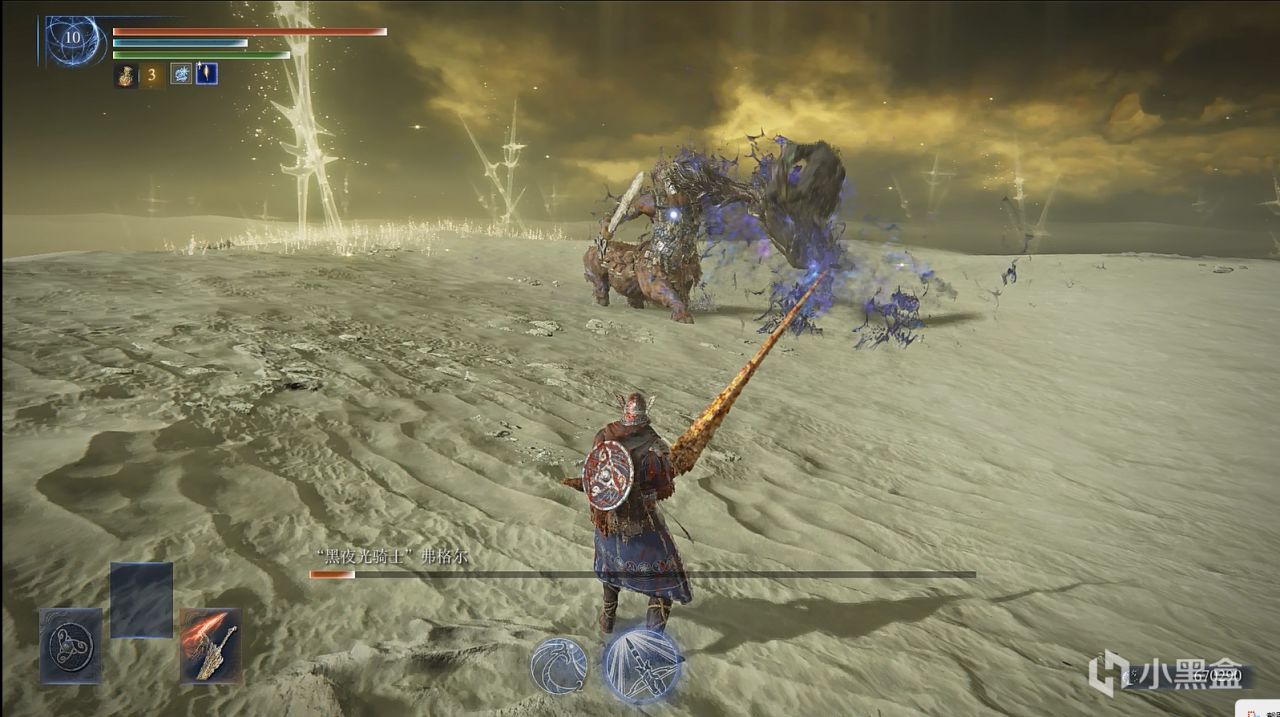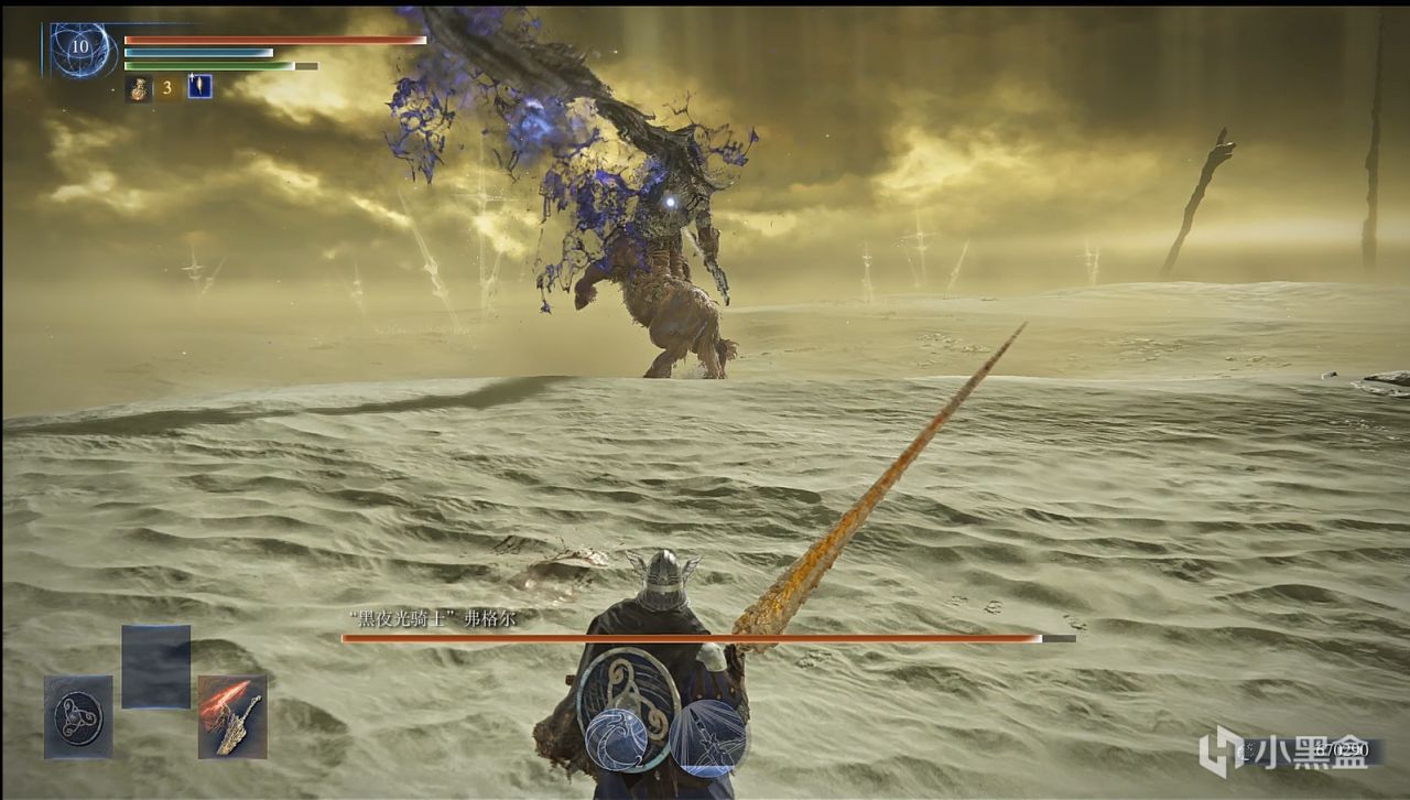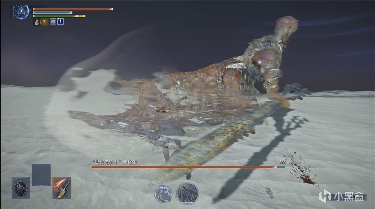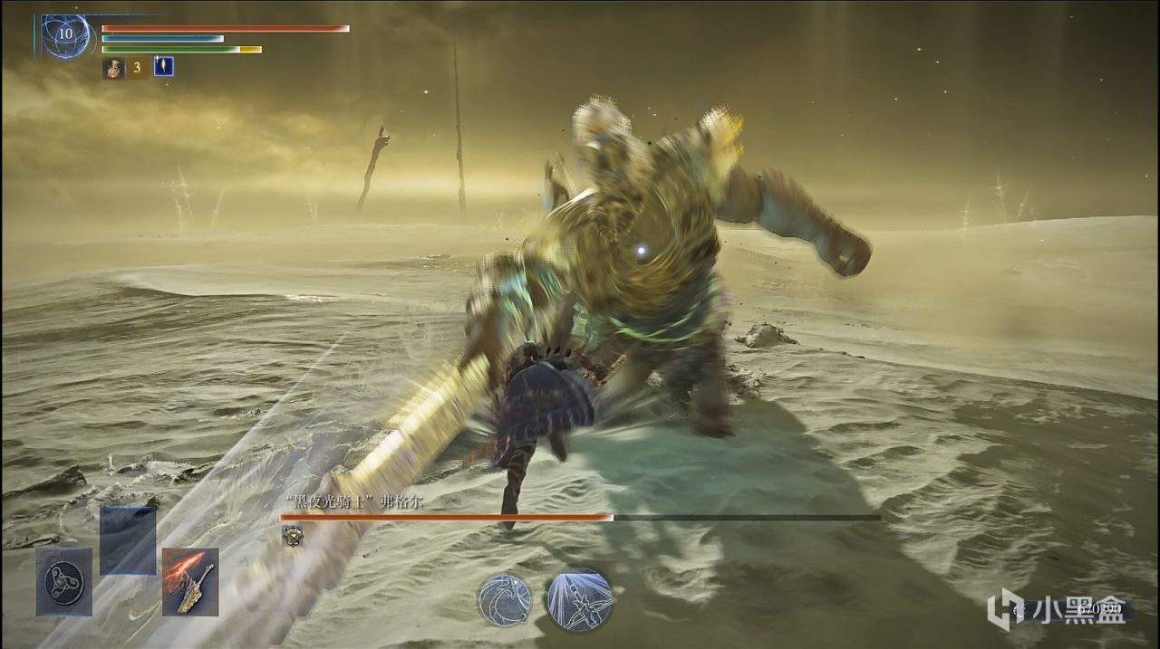 右側橫劈+前向氣浪,其實簡單,第一下看他武器滾即可(這應該都能滾吧),然後他會立刻小跳着三下繞到一邊,掃一陣氣浪,看氣浪接近時翻滾即可<這裏小小補充一下,這個連跳之後的氣浪也會單獨出,三連可能不出最後一下,直接取消轉而插地光矛,所以建議不要拉太遠的身位>