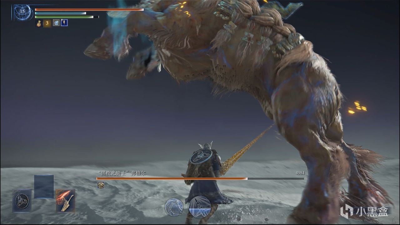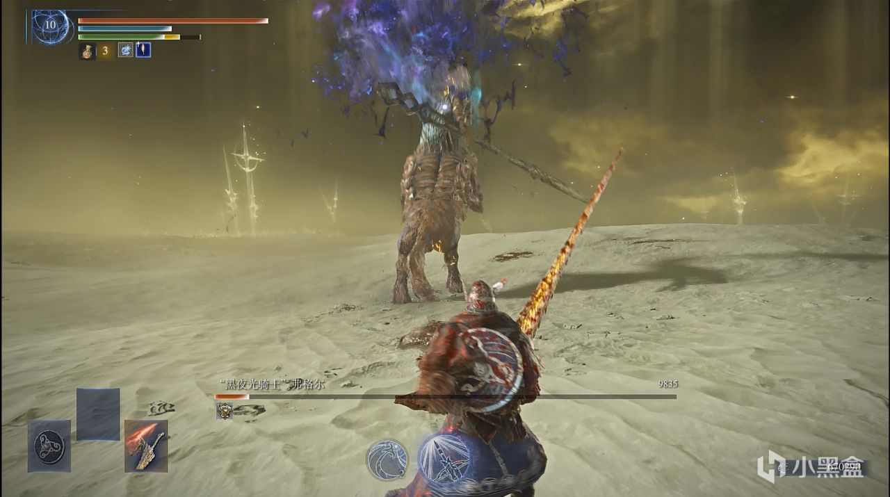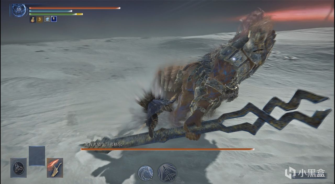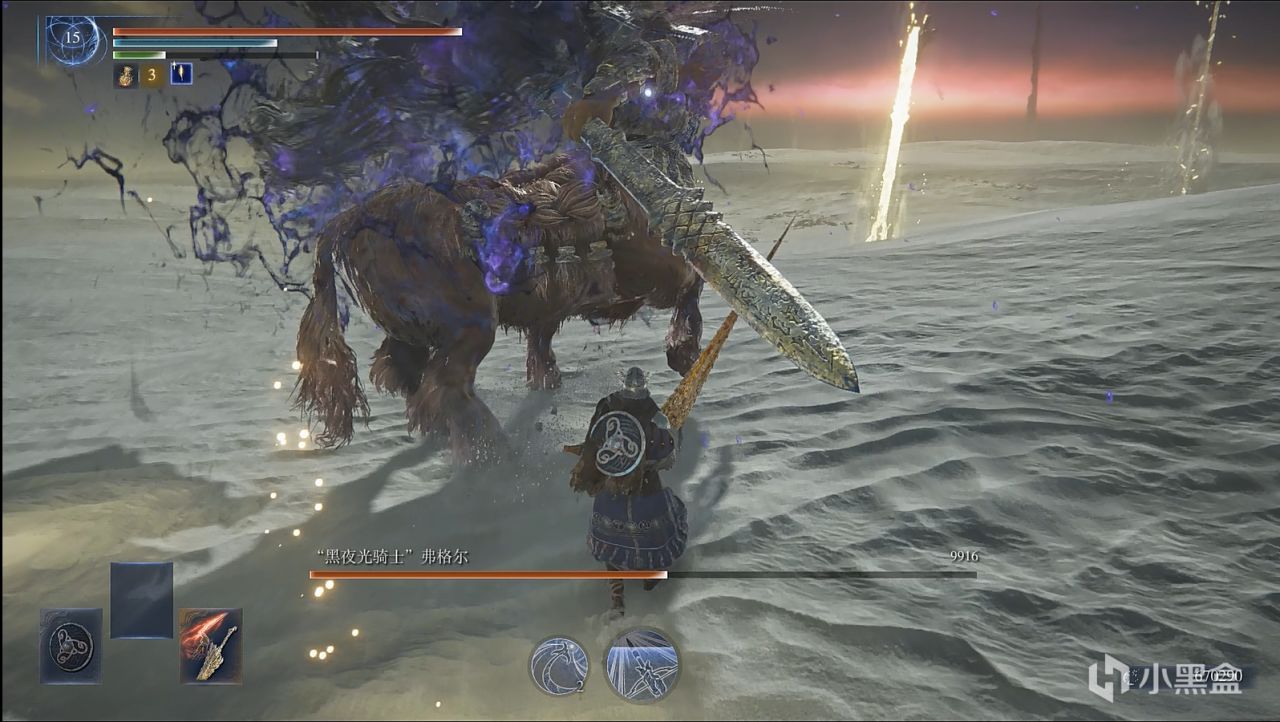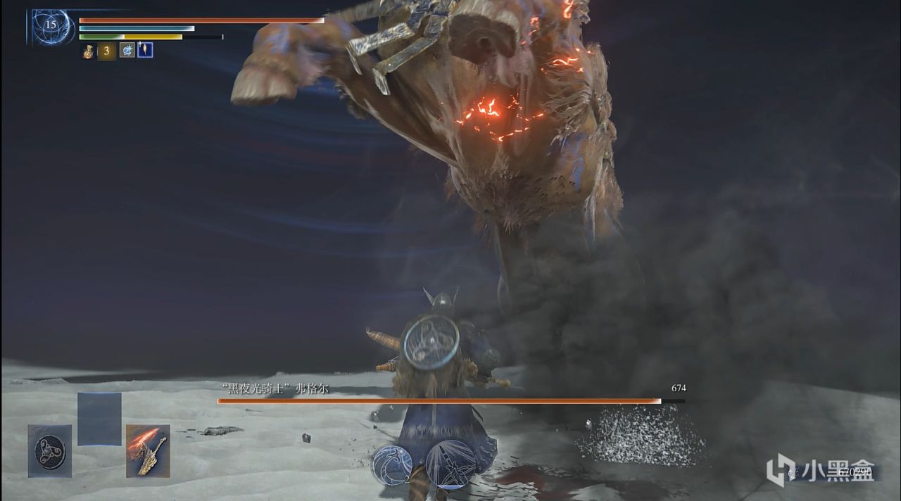 右側橫劈+前向氣浪,其實簡單,第一下看他武器滾即可(這應該都能滾吧),然後他會立刻小跳着三下繞到一邊,掃一陣氣浪,看氣浪接近時翻滾即可<這裏小小補充一下,這個連跳之後的氣浪也會單獨出,三連可能不出最後一下,直接取消轉而插地光矛,所以建議不要拉太遠的身位>