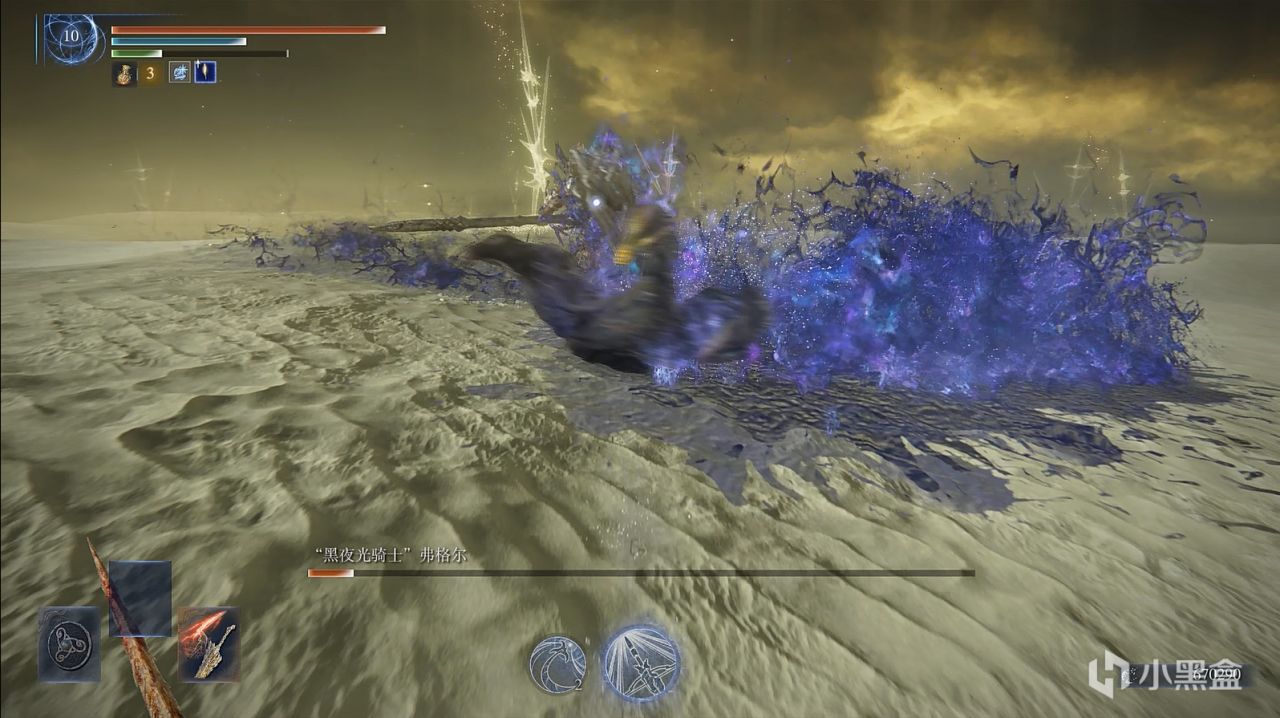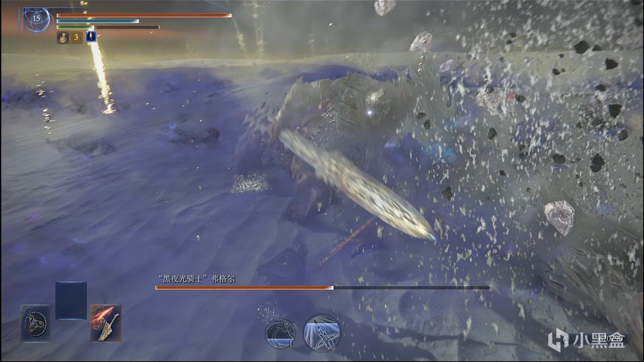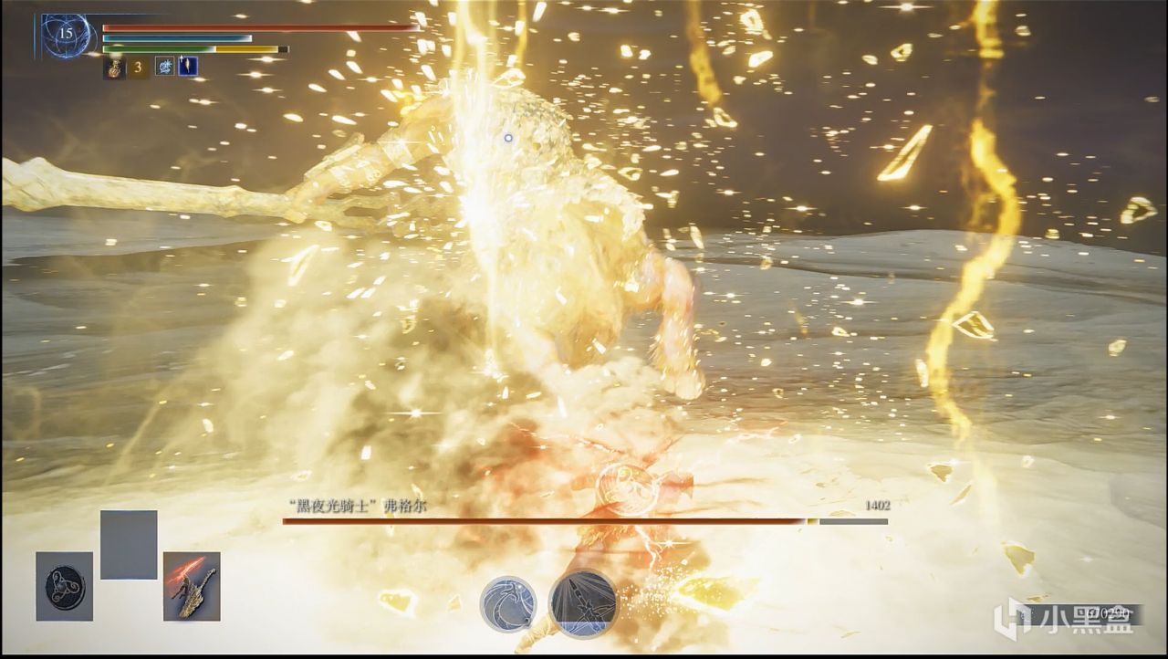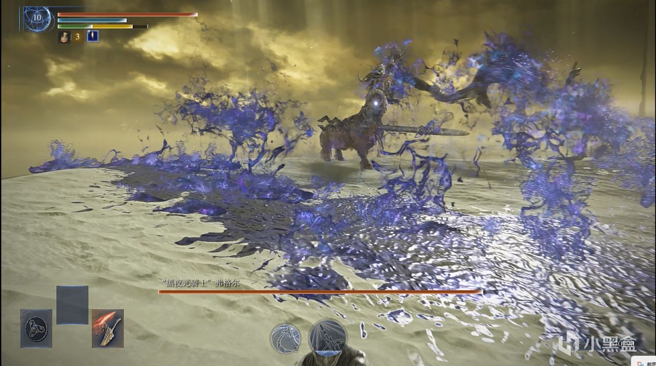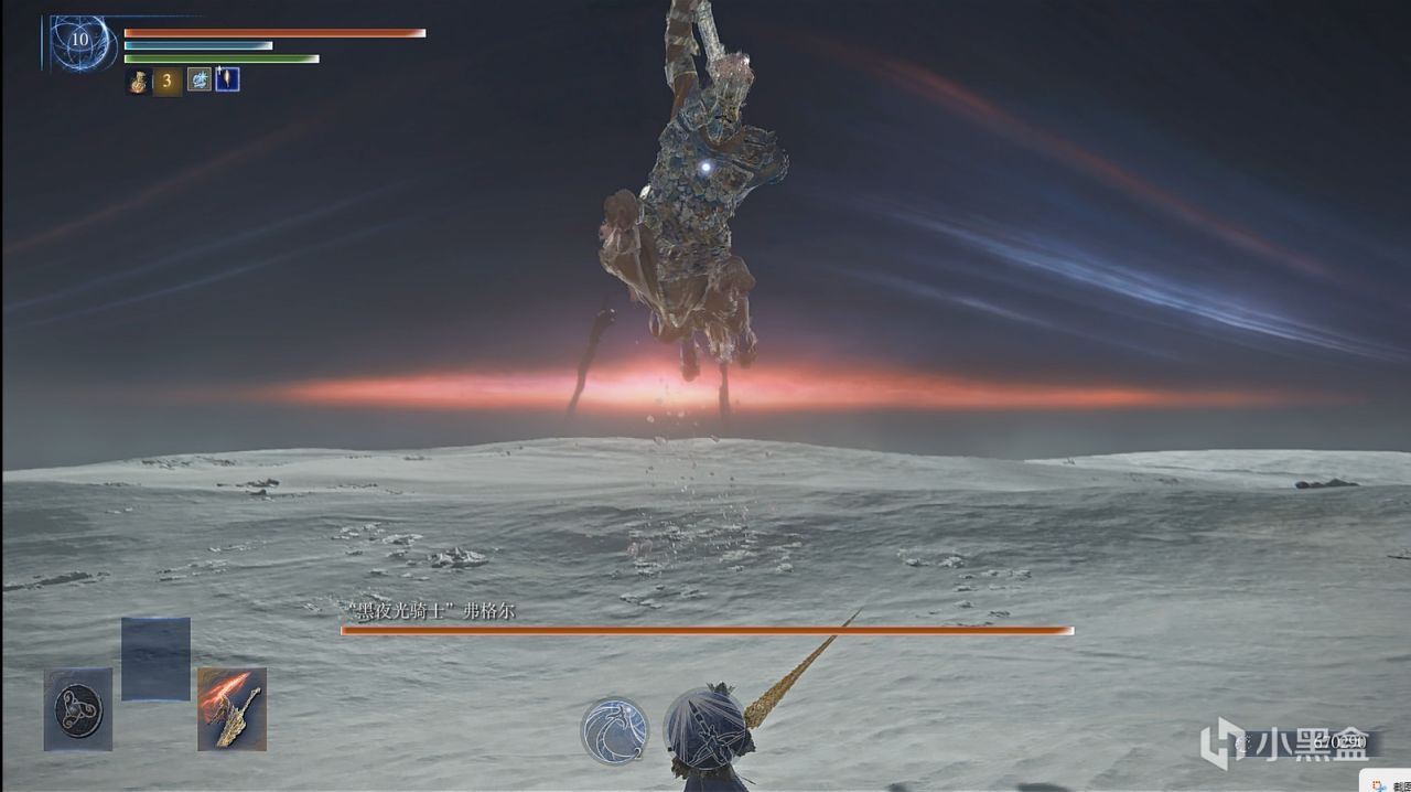 右側橫劈+前向氣浪,其實簡單,第一下看他武器滾即可(這應該都能滾吧),然後他會立刻小跳着三下繞到一邊,掃一陣氣浪,看氣浪接近時翻滾即可<這裏小小補充一下,這個連跳之後的氣浪也會單獨出,三連可能不出最後一下,直接取消轉而插地光矛,所以建議不要拉太遠的身位>