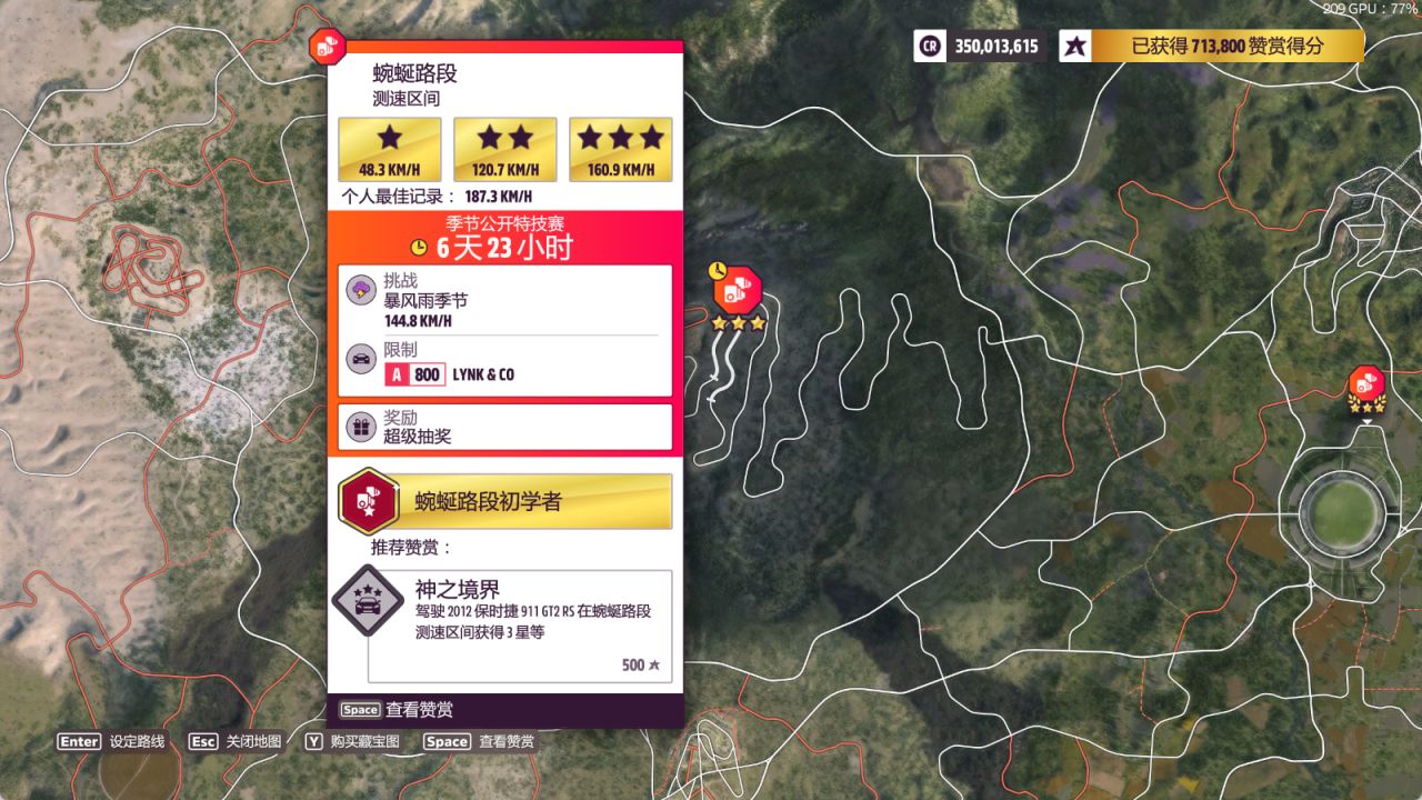测速区间:蜿蜒路段,完成奖励为超级抽奖(完成条件:187.3km/h)