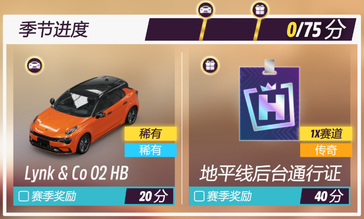 秋季赛20分进度奖励为2022款LYNK&CO 02 HATCHBACK和40分进度奖励为地平线后台通行证