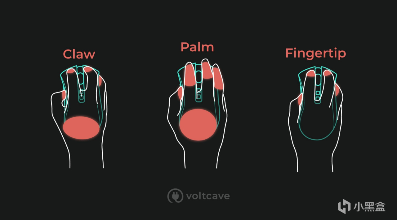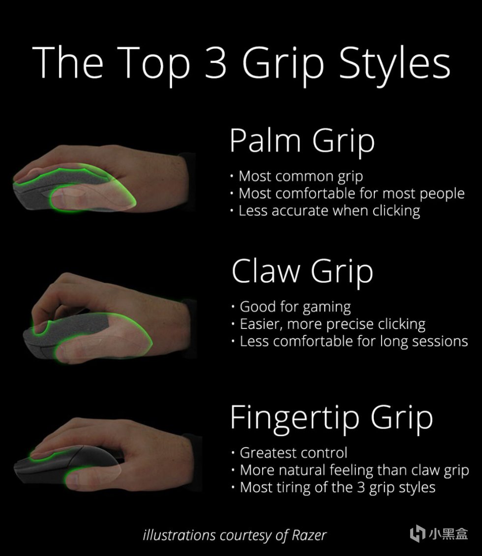 抓握:手心抵住鼠标屁股,手指像爪子一样扣住按键。