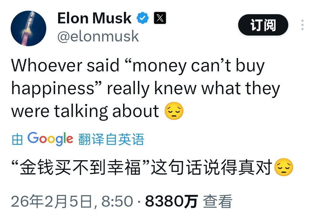 全球首富埃隆・馬斯克在社交平臺X發佈了一條引發熱議的推文:“Whoever said 'money can't buy happiness' really knew what they were talking about”,並附上了一個悲傷的表情符號。