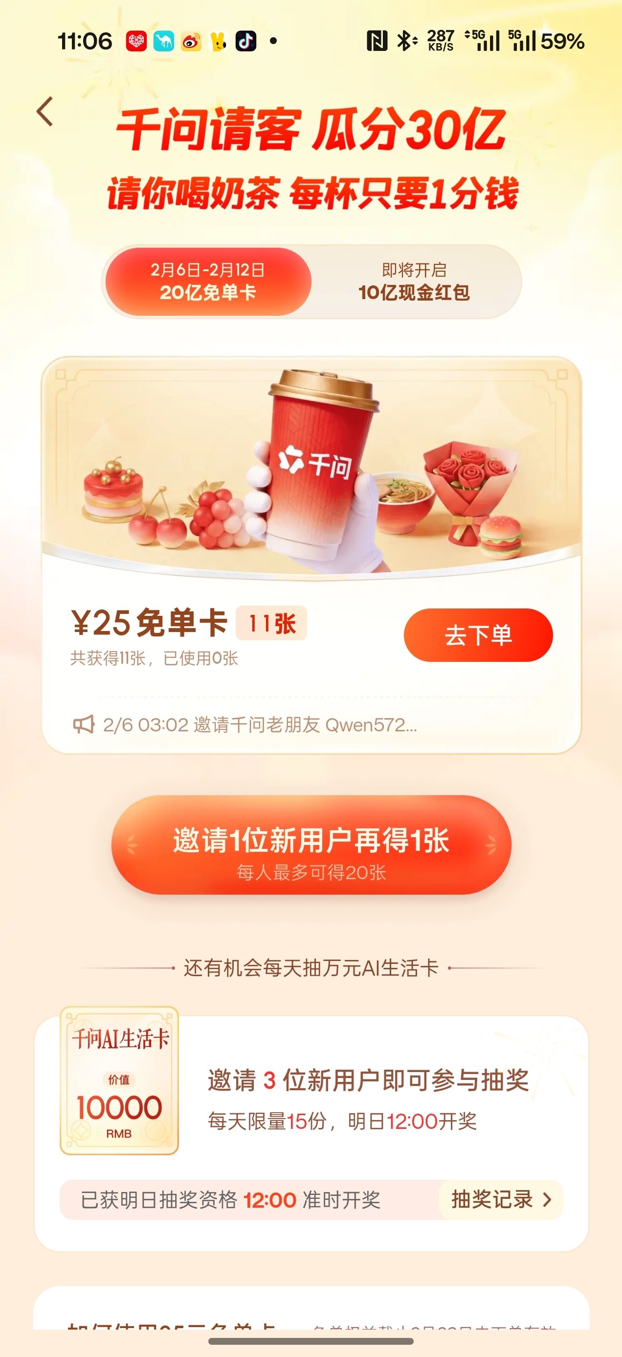 2月6日早上,千问APP“春节30亿大免单”正式上线,邀请全国人民用AI一句话免费点奶茶。活动期间,每个人可以领取21张无门槛的25元免单卡,相当于525块钱。