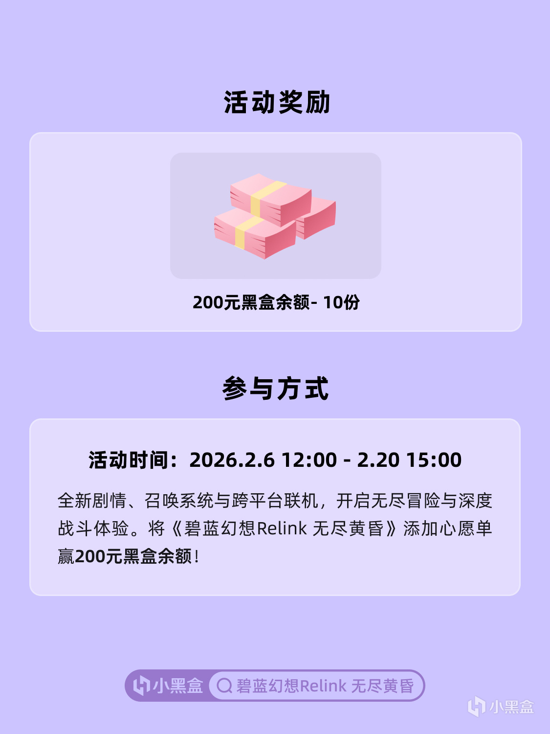 冒险进化,召唤降临跨平台共战!将游戏加入愿望单(https://api.xiaoheihe.cn/store/roll_room_v2?award_id=6040),即可成功参与活动,赢取200元黑盒余额。