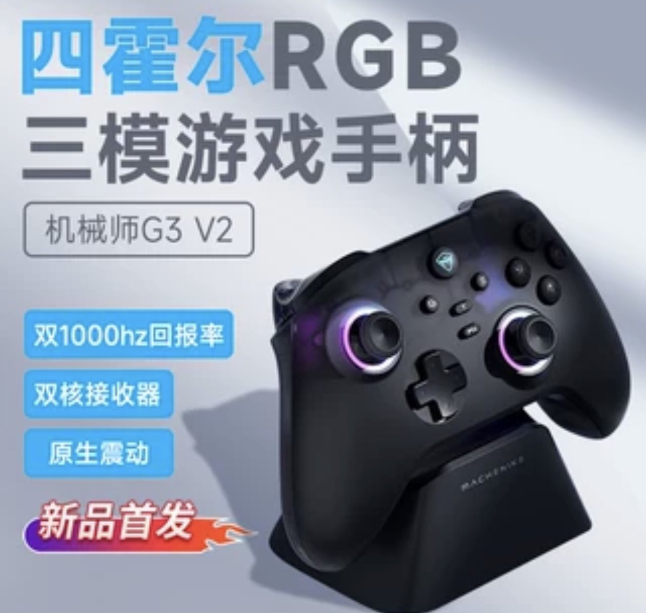 套裝版126元,是100出頭還帶底座的產品剛剛逛淘寶偷圖的時候,現在好像99都能拿下了。外觀非常標準的Xbox手柄模具和佈局,前面板做了透明磨砂,後板也有細膩的紋理,開機之後左右搖桿出了RGB分量級,同時因爲整個面板是半透明的,所以還會透出一些光來。電池方面給到了1000毫安時。按鍵上手柄的配件手感很不錯,觸發力度適中。雙霍爾一千赫茲也是行業標配,不過這個手柄的扳機反饋也比較輕。導電膠的十字鍵手感中規中矩,而且它雖然有個充電底座,卻不支持智能啓停。所以現在要買的話,個人推薦直接衝最近升級的G3V2 Pro版本,它還加上了一個遙杆調節,同時支持了陀螺儀和智能系統,但價格只加了20塊錢。