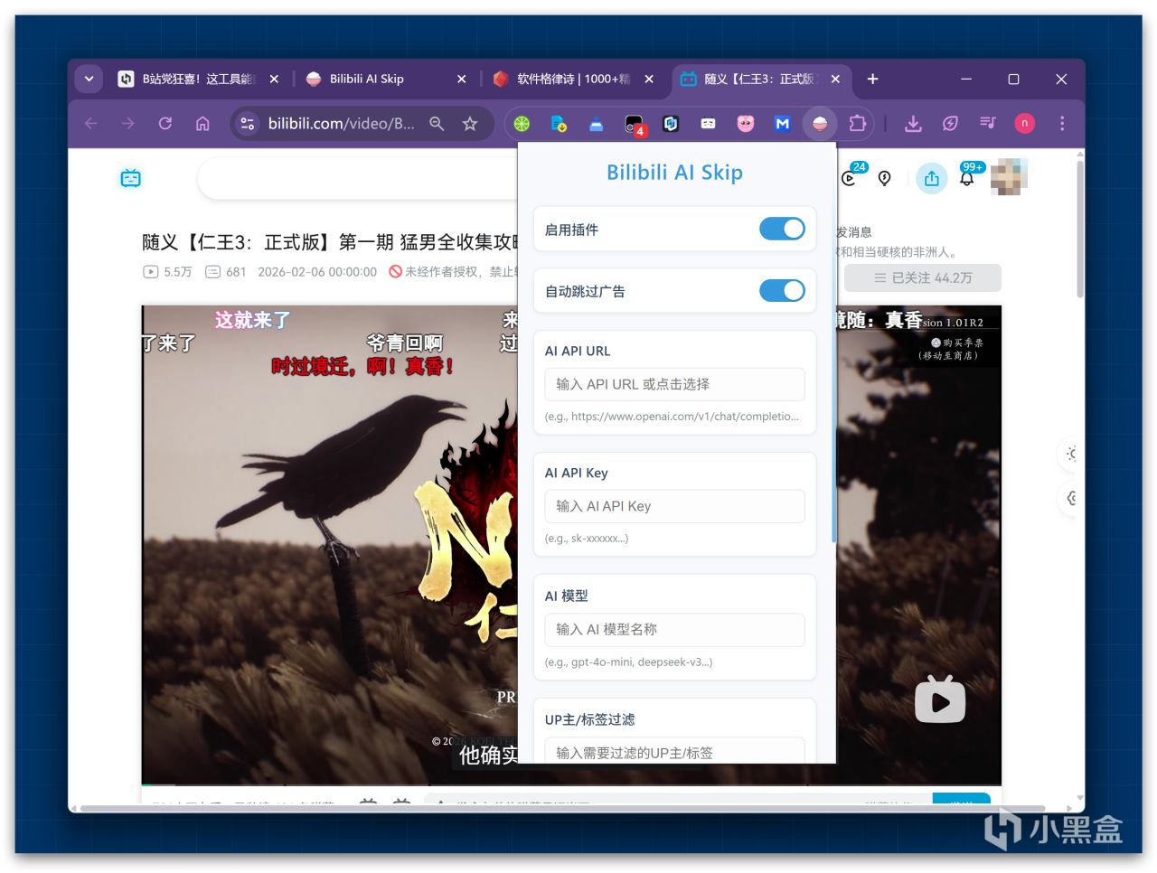 2. 開啓體驗:打開 B 站視頻,拓展會自動啓動 —— 有字幕的視頻秒識別廣告,沒字幕的視頻點擊 “啓用音頻分析”,等 1 分鐘左右就能識別,之後要麼自動跳,要麼手動跳,看你喜好。