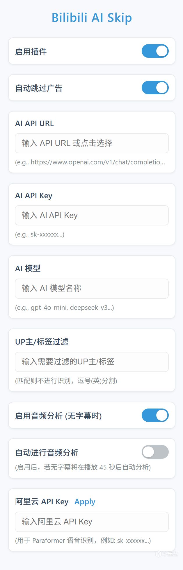 • 自定義設置,適配不同需求 進入拓展的設置頁面,能自己配置 AI 模型和 API 密鑰 —— 想省成本的話,用作者提供的免費內置 API(作者自費維護,不定期更新);追求更高準確率,就選 Gemini、GPT - 4.1 這些大模型(親測 Gemini - 2.5 Flash 又便宜又好用)。還能設置 “過濾 UP 主 / 標籤”,比如你關注的 UP 主視頻不想被識別廣告,添加到過濾列表裏就行。
