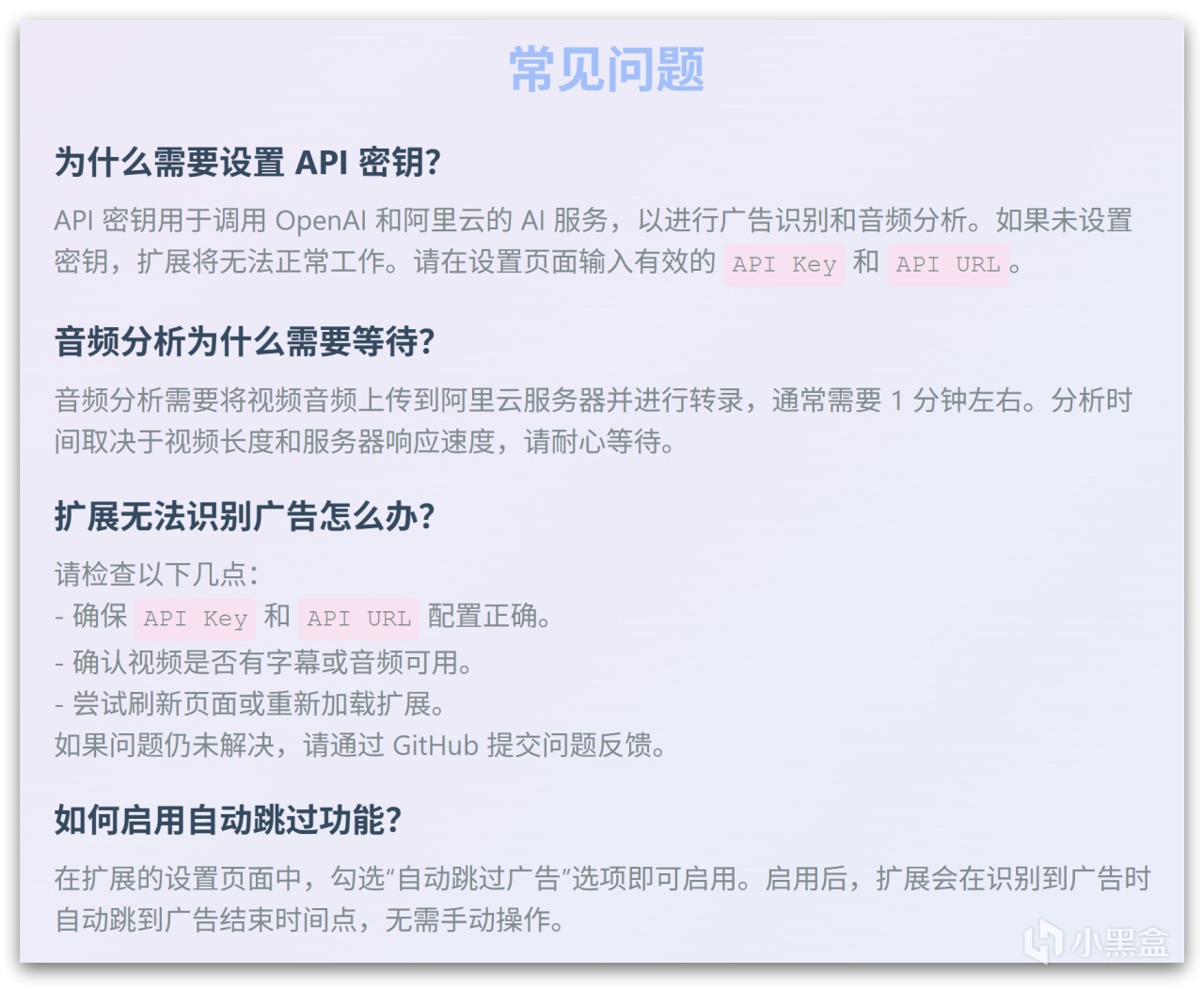 要是遇到問題,比如 API 配置不對、識別不到廣告,去設置頁面看 “常見問題”,裏面有詳細的解決辦法,小白也能輕鬆搞定。